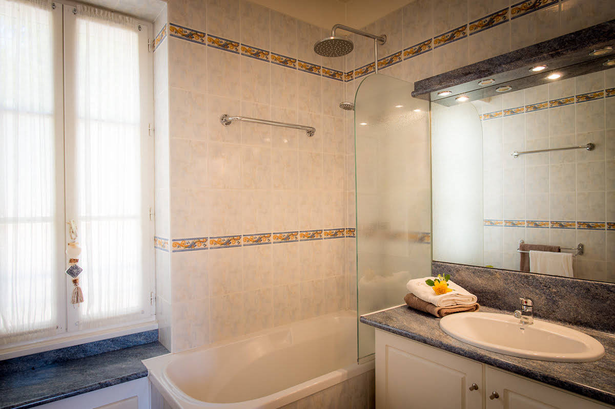 Ein luxuriöses Badezimmer mit Badewanne, Dusche und Badmöbeln mit Waschbecken und separatem WC. Bitte bringen Sie Ihre eigene Wäsche mit. Durch das Couloir haben Sie Zugang zu einer wunderschönen privaten Sonnenterrasse (40 m2) mit Gartenmöbeln direkt am Pool. Von dieser Terrasse haben Sie einen schönen Blick über die Dordogne. Dieses Ferienhaus eignet sich hervorragend für 2 Erwachsene oder 2 Erwachsene mit 2 Kindern. Babybetten und Hochstühle sind auf Anfrage erhältlich (kostenlos). Bitte geben Sie bei der Buchung an. Ein elektrischer Grill ist auf Anfrage erhältlich.