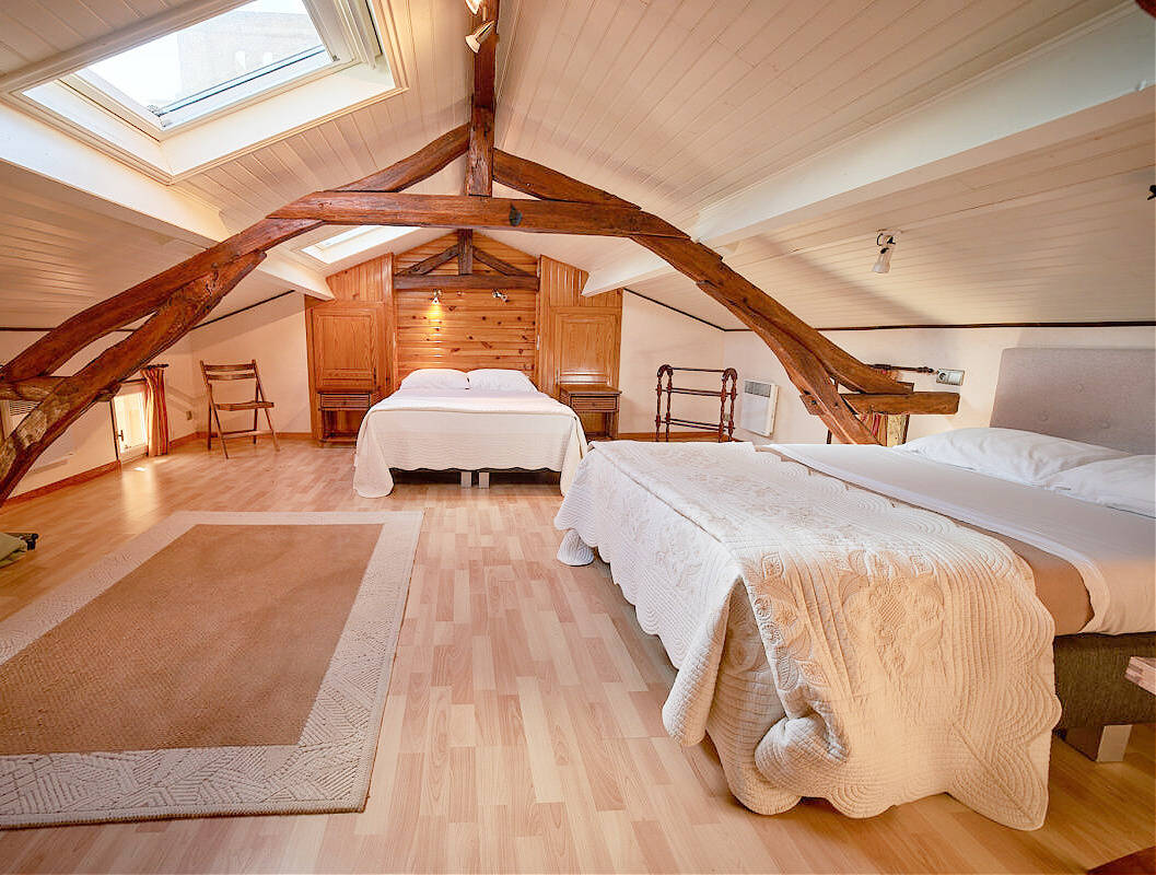 Schlafzimmer 2 ist ein Mansardenzimmer mit zwei Doppelbetten