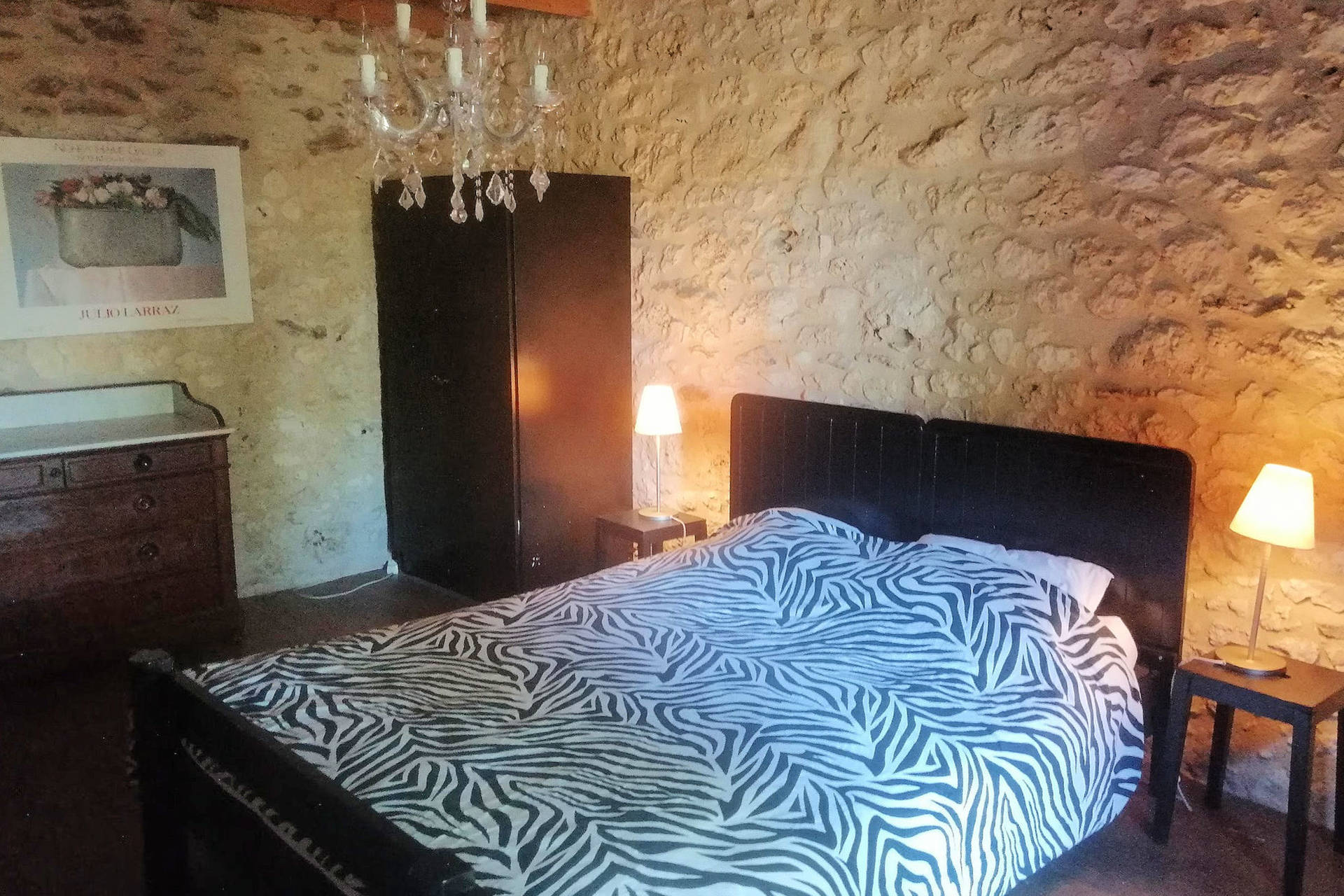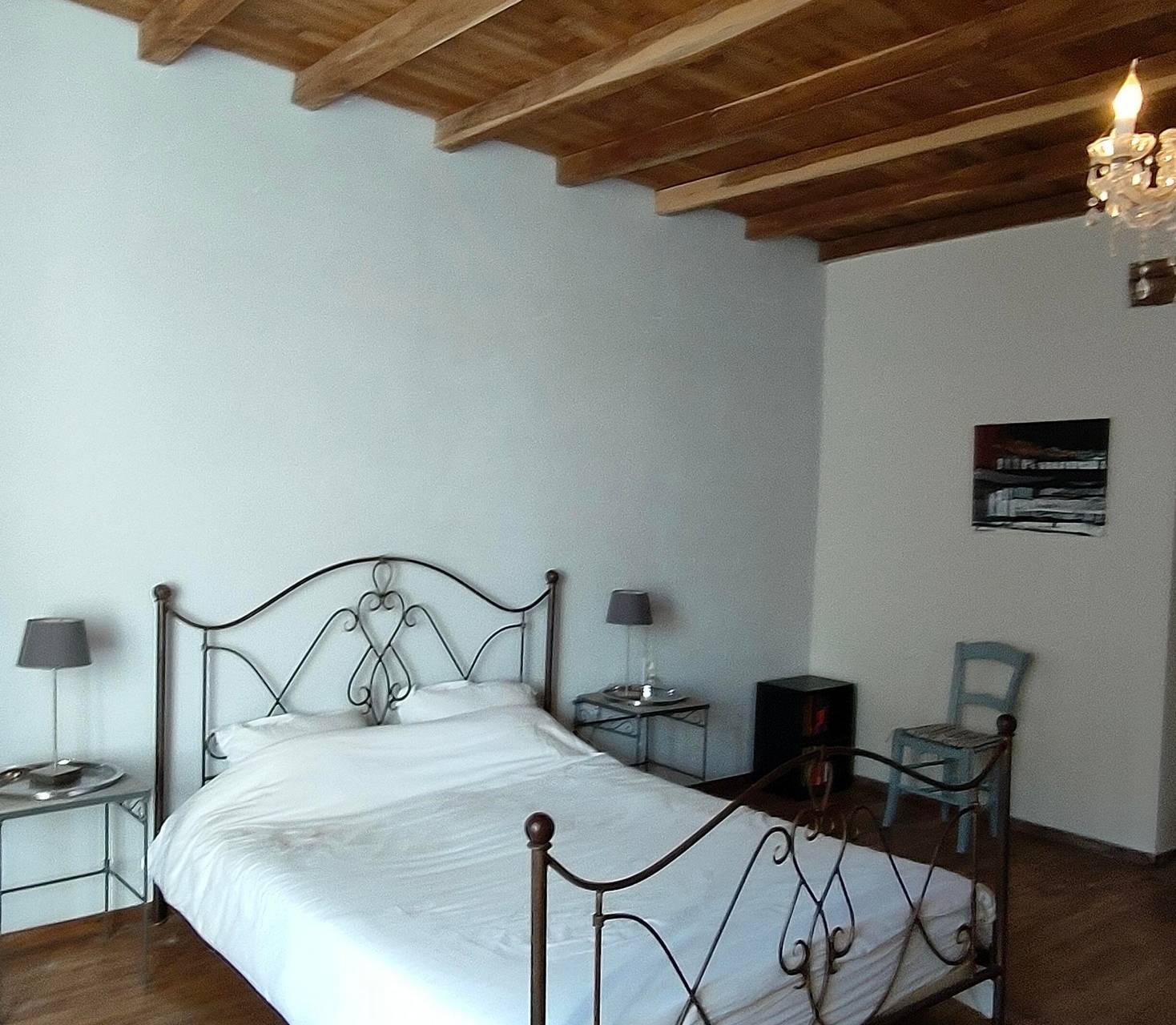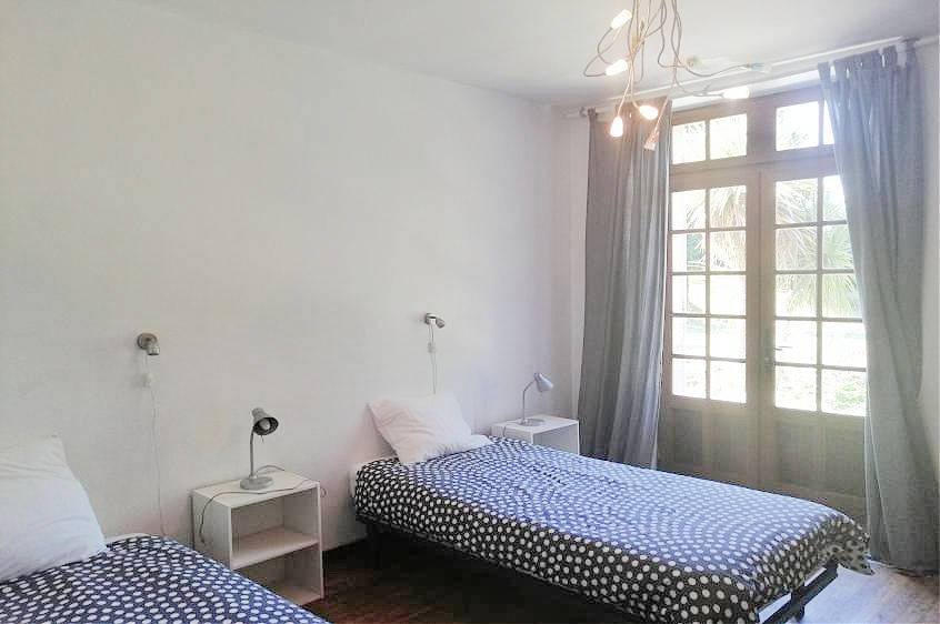 Schlafzimmer 2: Authentisches Doppelbett (140 x 200 cm) und Flügeltüren zur überdachten Terrasse. Angrenzend befindet sich ein zweites Badezimmer mit Waschbecken, Dusche und Waschmaschine.