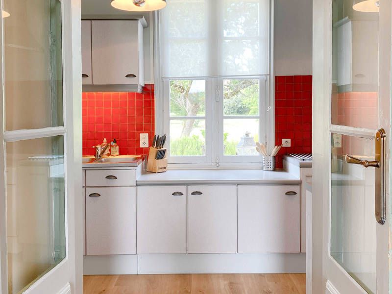 Das Apartment La Barge ist für 2 Personen geeignet und befindet sich im rechten Turm des Gebäudes. Die Wohnung hat einen eigenen Eingang auf der Gartenseite. Durch den Eingang betreten Sie den Flur und die angrenzende geräumige Küche. Die Küche ist komplett ausgestattet mit Backofen, Mikrowelle, Geschirrspüler, Kaffeemaschine und Waschmaschine. Sie haben Zugang zu einem Kühlschrank mit Gefrierfach. Mit Gas können Sie köstliche Mahlzeiten mit den in der Region reichen lokalen Produkten zubereiten.