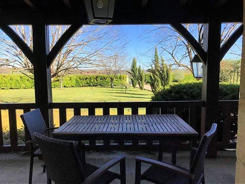 Überdachte Terrasse von 30 m² mit Gartenmöbeln, Grill und Blick auf den Garten und Swimmingpool und das angrenzende Tal. Der Swimmingpool ist von Mai bis September geöffnet. Sie teilen sich den Swimmingpool mit 1 weiteren Ferienhaus. Dienstleistungen + Bedingungen