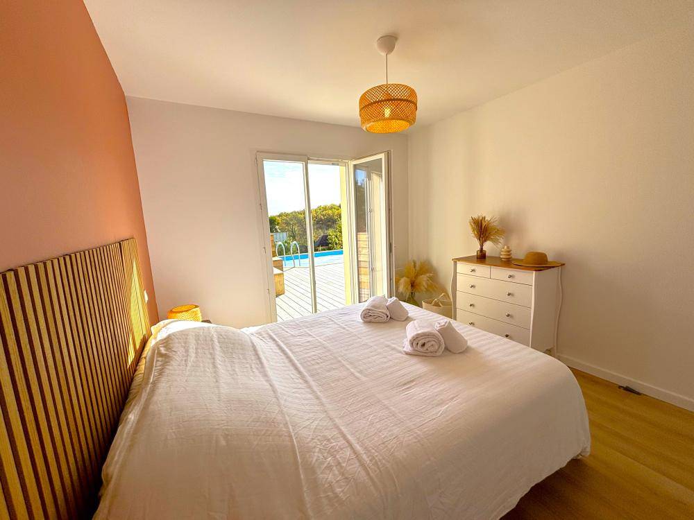 Schlafzimmer 1: Großes Doppelbett (160 x 200 cm), Glastür zur Terrasse, Nachttische, Kommode und Klimaanlage.