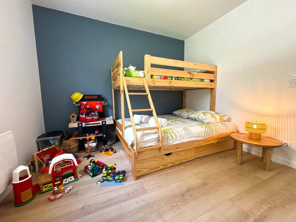 Schlafzimmer 2: Geeignet für 2–3 Personen, mit Doppelbett (140 cm), Etagenbett, Nachttisch, Kommode und Klimaanlage. Verschiedenes Spielzeug für Kinder ist ebenfalls vorhanden.