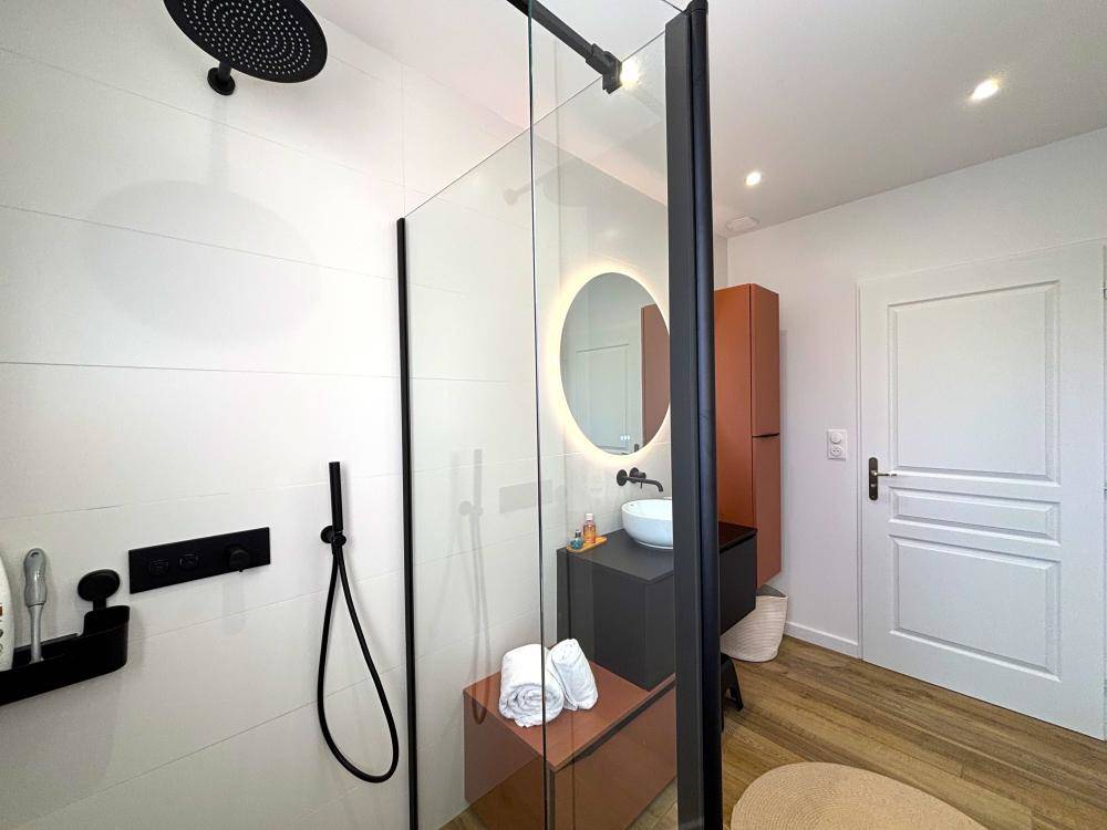 Badezimmer: Elegante, geflieste, ebenerdige Dusche, Waschbecken, Spiegel und beheizter Handtuchhalter.