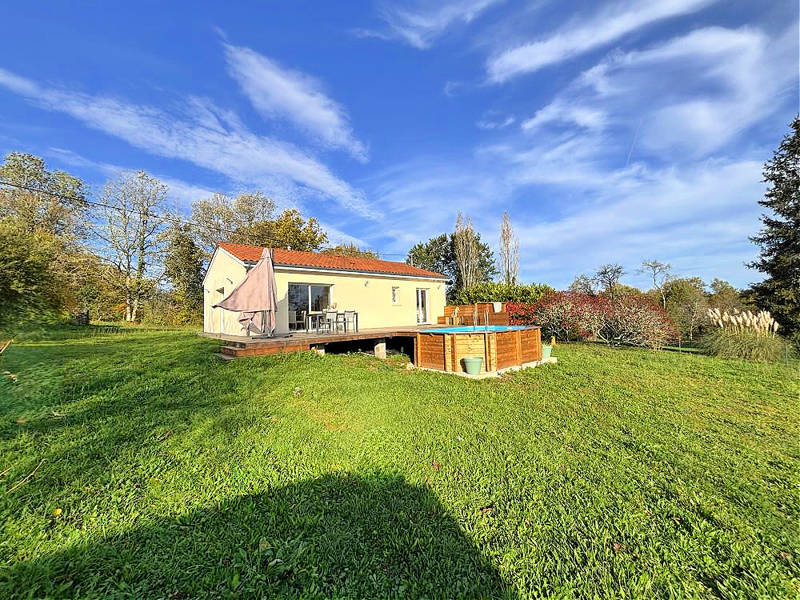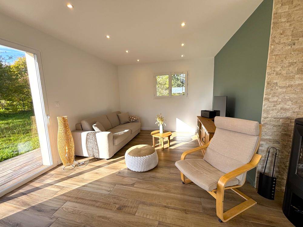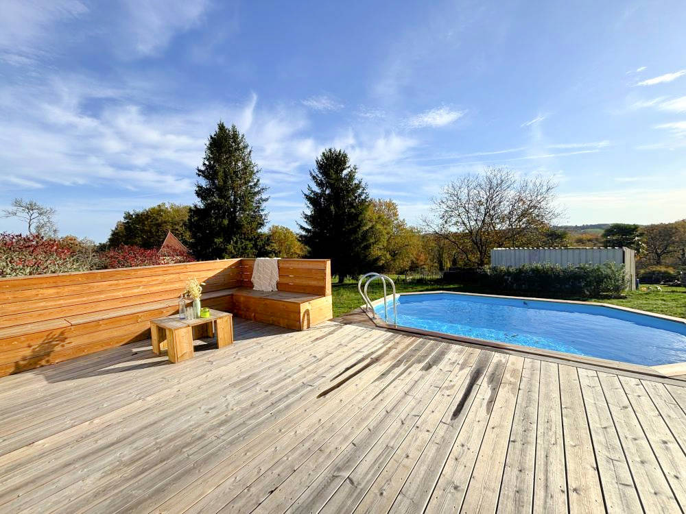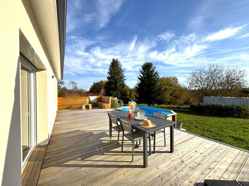 Terrasse (70 m²): Essbereich mit Tisch, 4 Stühlen und Sonnenschirm, Sitzecke mit Holzbank und Couchtisch. Privater Swimmingpool (5 x 3,5 m, 1,2 m tief): Mit Unterwasseralarm gesichert und von Mai bis Mitte Oktober beheizt.Garten (1500 m²): Große Rasenfläche, ideal für Spiele und Sport, inklusive Boulebahn.Parkplatz: Für 2–3 Autos, inklusive Ladestation für Elektrofahrzeuge.