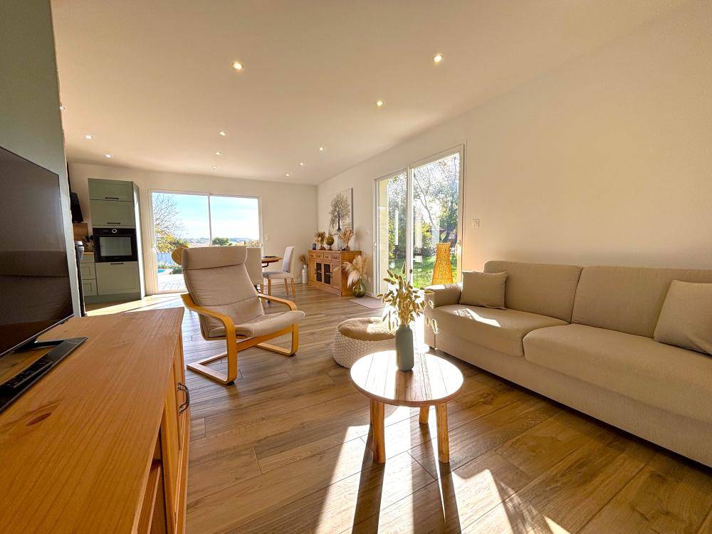 Eingangsbereich: mit Garderobe und Abstellraum. Wohnzimmer (45 m²): Zwei große Glastüren schaffen eine fließende Verbindung zwischen Innen- und Außenbereich. Das Wohnzimmer ist in mehrere Bereiche unterteilt: