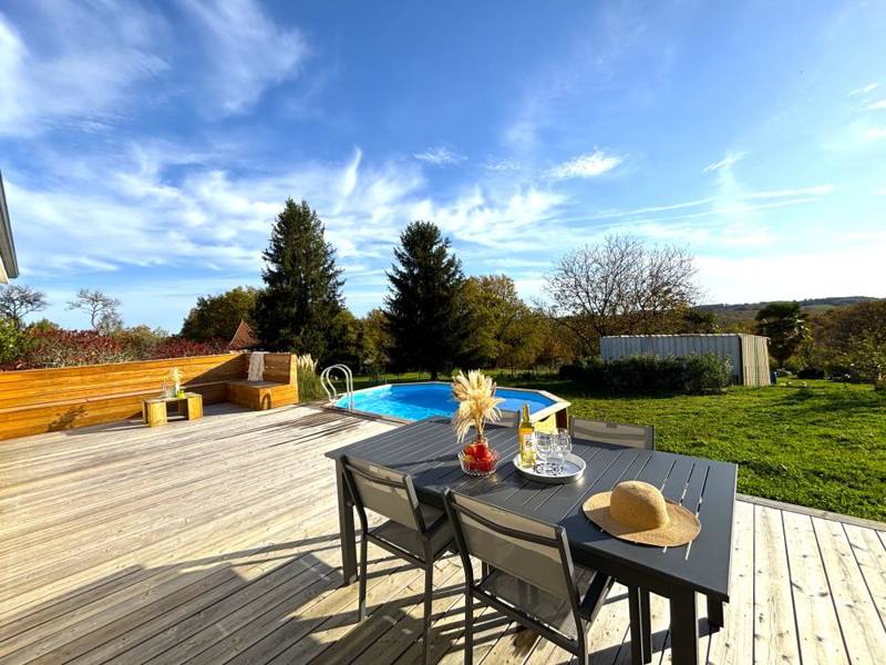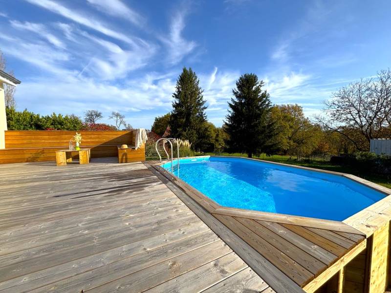 Draußen lädt eine große, 70 m² große Holzterrasse mit Sitz- und Essbereich sowie ein privater, von Mai bis Mitte Oktober beheizter Swimmingpool zum Entspannen unter der Sonne der Dordogne ein.