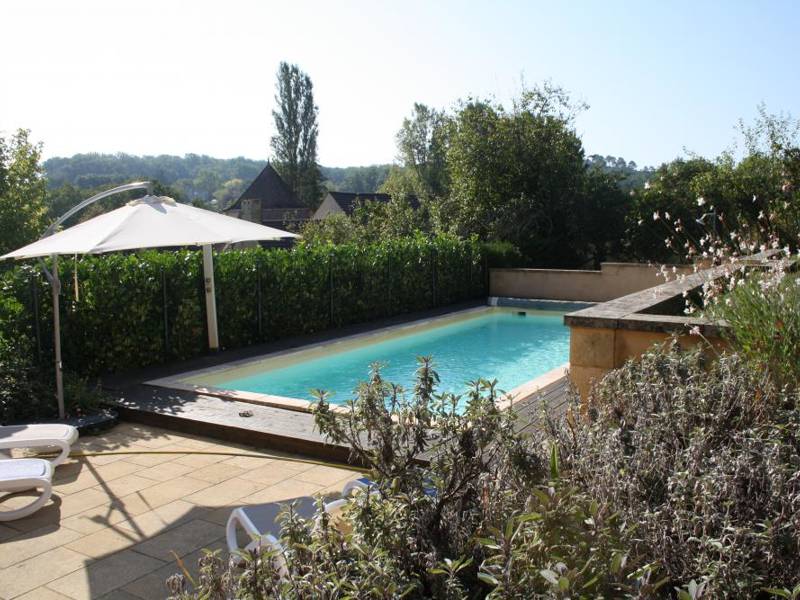 Eine mit Weinreben bewachsene Terrasse, die vom Wohnzimmer und vom Flur in der Mitte der Etage aus zugänglich ist, bietet einen schattigen Bereich zum Frühstück oder für einen Aperitif und führt zum großen Garten mit Rasen und Steinbrunnen. Der private beheizte Pool ist von Terrassen umgeben und verfügt über eine geflieste Terrasse, die mit Sonnenliegen, Sonnenschirm sowie Tisch und Stühlen für Mahlzeiten im Freien ausgestattet ist. Vom Schwimmbad aus haben Sie direkten Zugang zum „Schulgebäude“ (der ehemaligen Mädchenschule des Dorfes). Diese wurde kürzlich in eine große und voll ausgestattete Sommerküche mit Gasherd, Kühlschrank mit Gefrierfach, Geschirrspüler und großem Esstisch und Stühlen umgewandelt. Mit seinen dicken Steinmauern und freiliegenden Balken bietet es einen kühlen Platz direkt neben dem Pool, ideal für lange, entspannte Mittagessen in der Sommerhitze! Ein Paar Eisentore, die auf der Rückseite des Grundstücks versteckt sind, ermöglichen den Fahrzeugzugang und es gibt einen sicheren Parkplatz für zwei Autos in der Nähe der alten Scheune, an deren Fassade Kiwipflanzen wachsen!