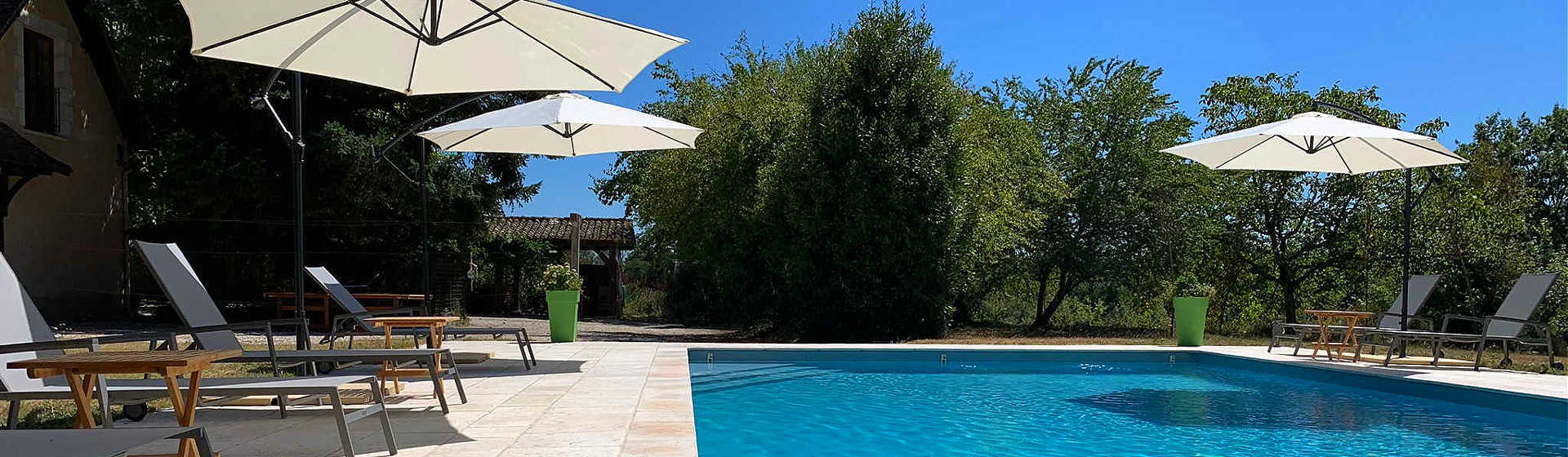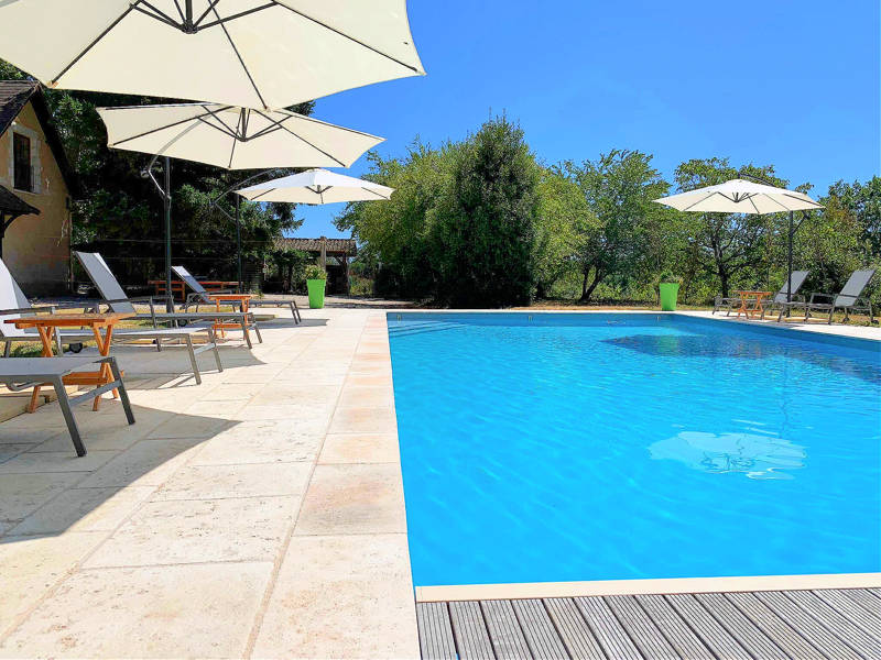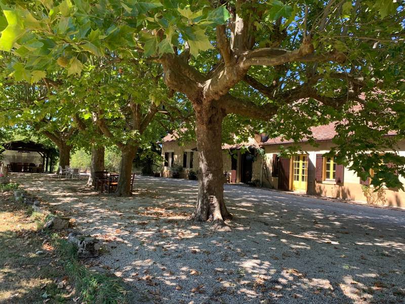 Das Haus ist von wunderschönen Gärten umgeben, die 5.000 m² umfassen. Die Gärten bestehen aus Rasen, Wald und Blumen. Die Zufahrt zur Domaine Le Relais wird von Platanen gesäumt. Vor der Domaine Le Relais finden Sie einen überdachten Essbereich mit Steinofen. Hinter dem Haus befindet sich eine große Terrasse mit Esstisch und Stühlen, die von der Küche und dem Essbereich aus betreten wird. Hier finden Sie auch den Swimmingpool (14 m lang und 6 m breit), der von einer Terrasse mit Liegestühlen umgeben ist. Vor und neben dem Haus sind ausreichend Parkplätze vorhanden. Der Pool ist ideal zum Bahnenschwimmen oder für Kinder zum Spielen.