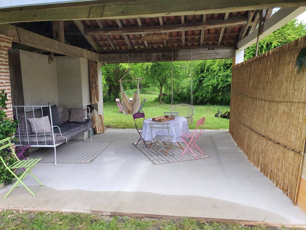 Überdachter Wohnbereich mit Sofa und Tisch