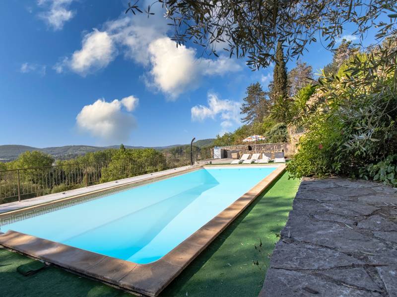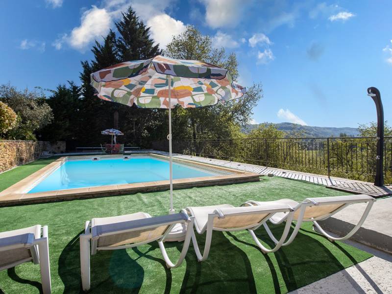 Eingang über die große Terrasse an der Vorderseite des Hauses. Die Terrasse ist nach Süden ausgerichtet und teilweise überdacht, um an heißen Sommertagen Schatten zu spenden. Zwei Terrassen, beide mit Tischen und Stühlen für Mahlzeiten im Freien ausgestattet. Ein großer privater Swimmingpool, 10 m x 5 m und 0,80 m bis 2,10 m tief. Zur Sicherheit der jüngsten Urlauber gibt es ein Tor mit Schloss. Ausgewachsene Bäume und Sträucher wie Olivenbäume, Palmen. Großer Bereich hinter dem Haus, ideal zum Spielen für Kinder (komplett eingezäunt) und Platz zum Parken von 4 Autos.