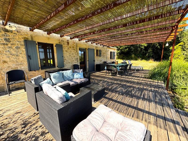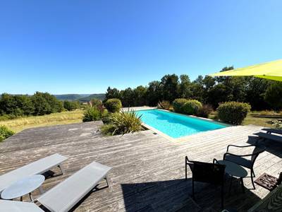 Obwohl die Villa Cazenac charmant und komfortabel eingerichtet ist, werden Sie zweifellos die meiste Zeit draußen verbringen, eingelullt vom Gesang der Vögel und den Geräuschen der Natur. Die große, halbüberdachte Holzterrasse ist mit einem Tisch und bequemen Gartenmöbeln ausgestattet, sodass Sie unter dem Sternenhimmel speisen können. Ein Grill steht zur Verfügung. Passend dazu lädt der private Swimmingpool von 9x4,5m zu erfrischenden Bädern ein. Für den Komfort unserer Gäste ist das Schwimmbad mit einer elektrischen Unterwasserluke gesichert, mit Salz behandelt und von Mai bis Ende September auf mindestens 25 Grad beheizt. Es gibt einen großen Garten von 5000m², der von Wäldern und Wiesen begrenzt wird. Auf dem Gelände können Sie problemlos 2 bis 3 Autos parken