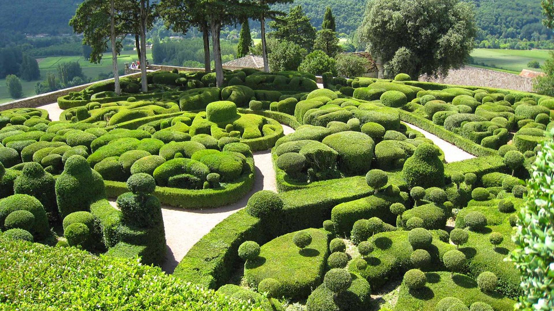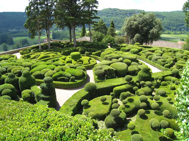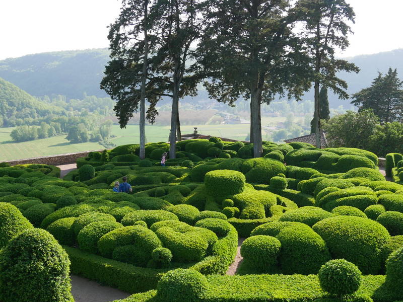 Les Jardins de Marqueyssac is a beautifully situated garden high on a rock where you imagine yourself to be in the fairy tale of Alice in Wonderland. There are thousands of box trees and there are peacocks walking around and there is a forest and several children's playgrounds. From all sides there is an amazing view of the Dordogne valley, with the castles of Castelnaud and Beynac in the distance.