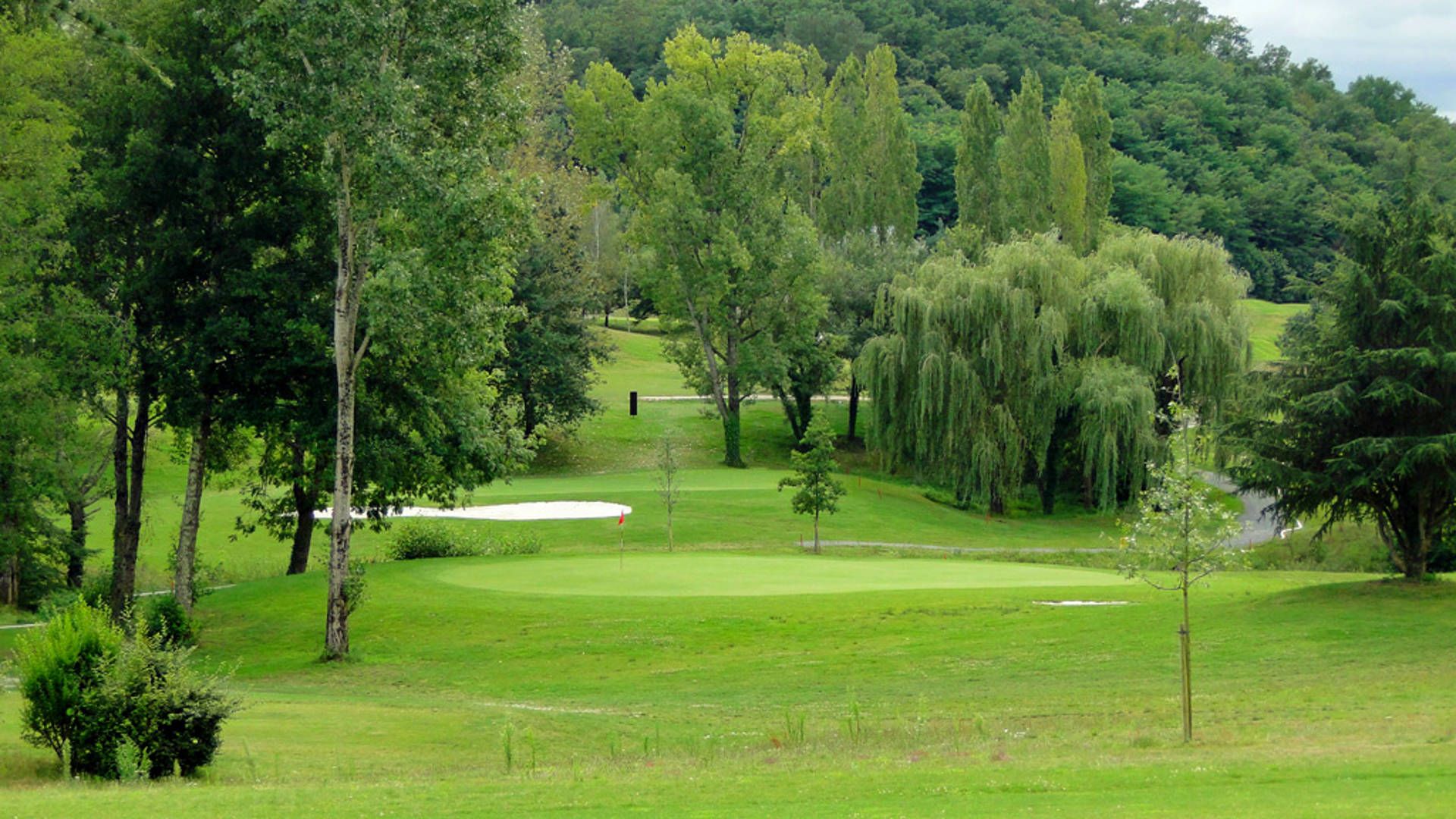 18 Holes. Steep hilly terrain with a troublesome stream that crosses the golf course. Buggy recommended.
