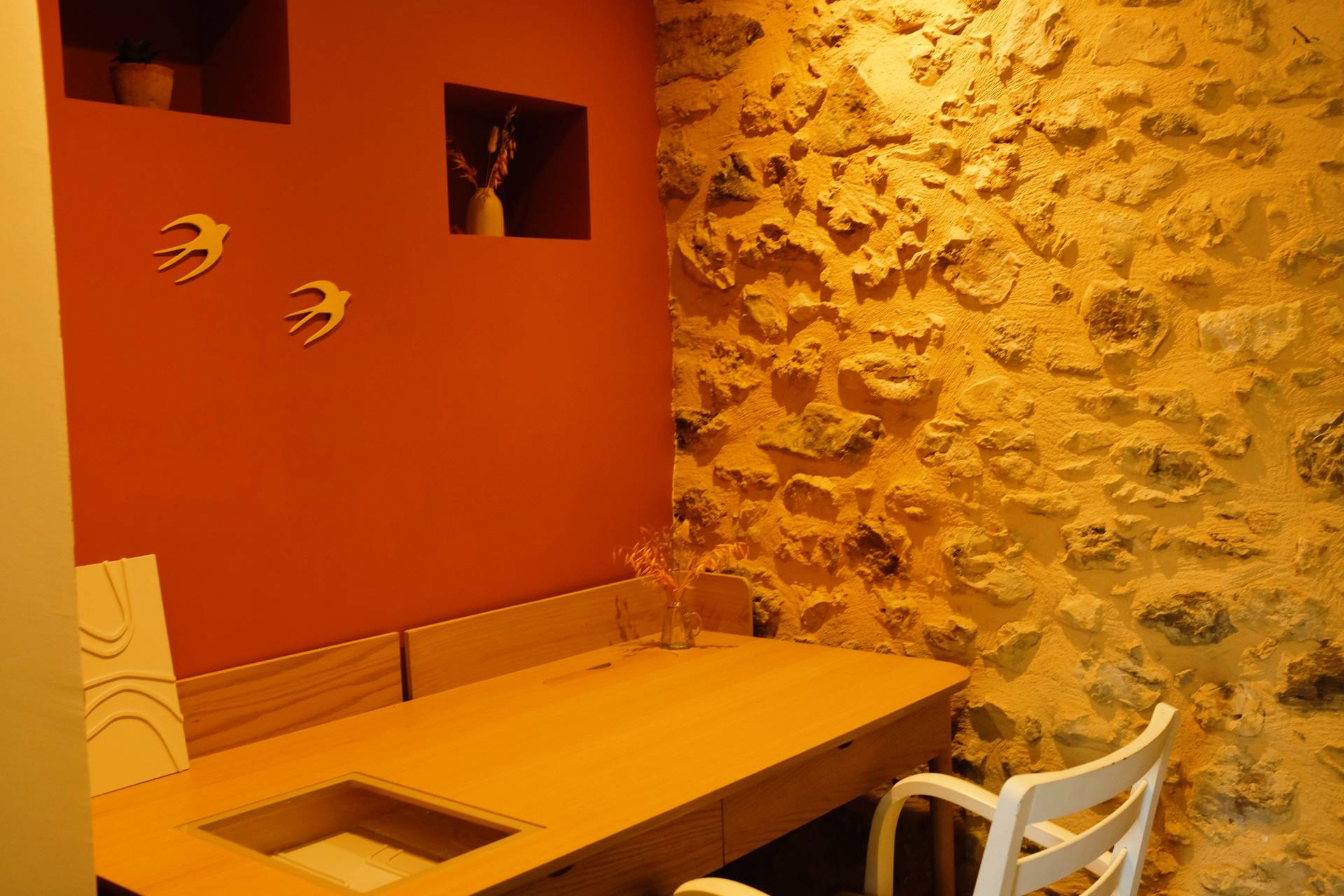 En de woonkamer was heel gezellig door die prachtige stenen muur, karakteristiek voor huizen in deze streek. Er staat een vakkenkast met manden met speelgoed en puzzels voor kinderen. Het grote terras aan de achterzijde van het huis heeft 2 losse tafels met zeker 10 stoelen en een grote, elektrische bedienbare, luifel. En als het ons echt te warm werd in de zon aan de achterkant van het huis, verhuisden wij naar de voorzijde in de schaduw.