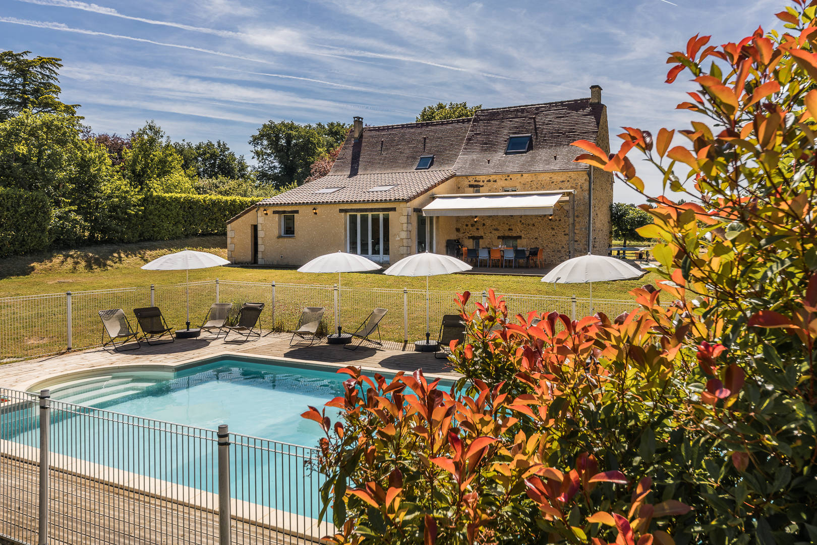 Voor ouders met kleine kinderen is het geruststellend om te weten dat het zwembad omheind is, met een speciale vergrendeling op het toegangshekje. Ook hier voldoende ligbedden en luie stoelen. De enorme tuin/weide achter en naast het huis is een waar speelparadijs voor kinderen. Er is een aangelegde jeu de boulesbaan en er staat een grote tafeltennistafel. In de kist in de keuken liggen tafeltennisbatjes en badmintonrackets. Natuurlijk ontbreekt ook de BBQ niet. Wat een geweldig huis!