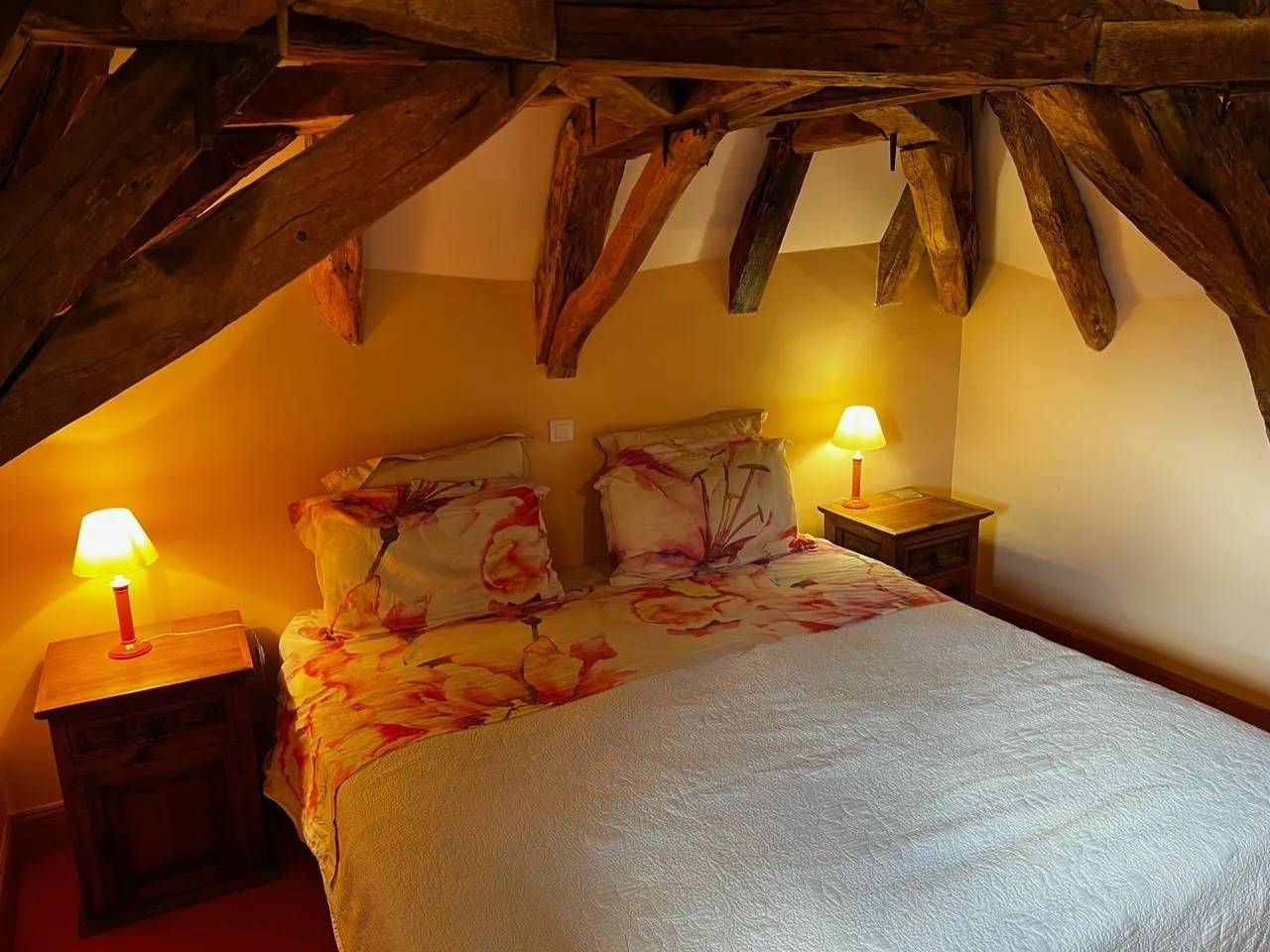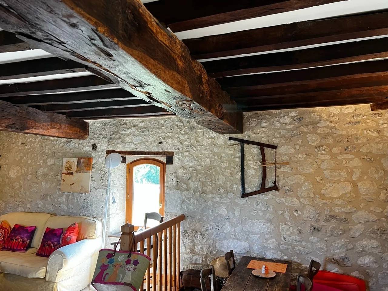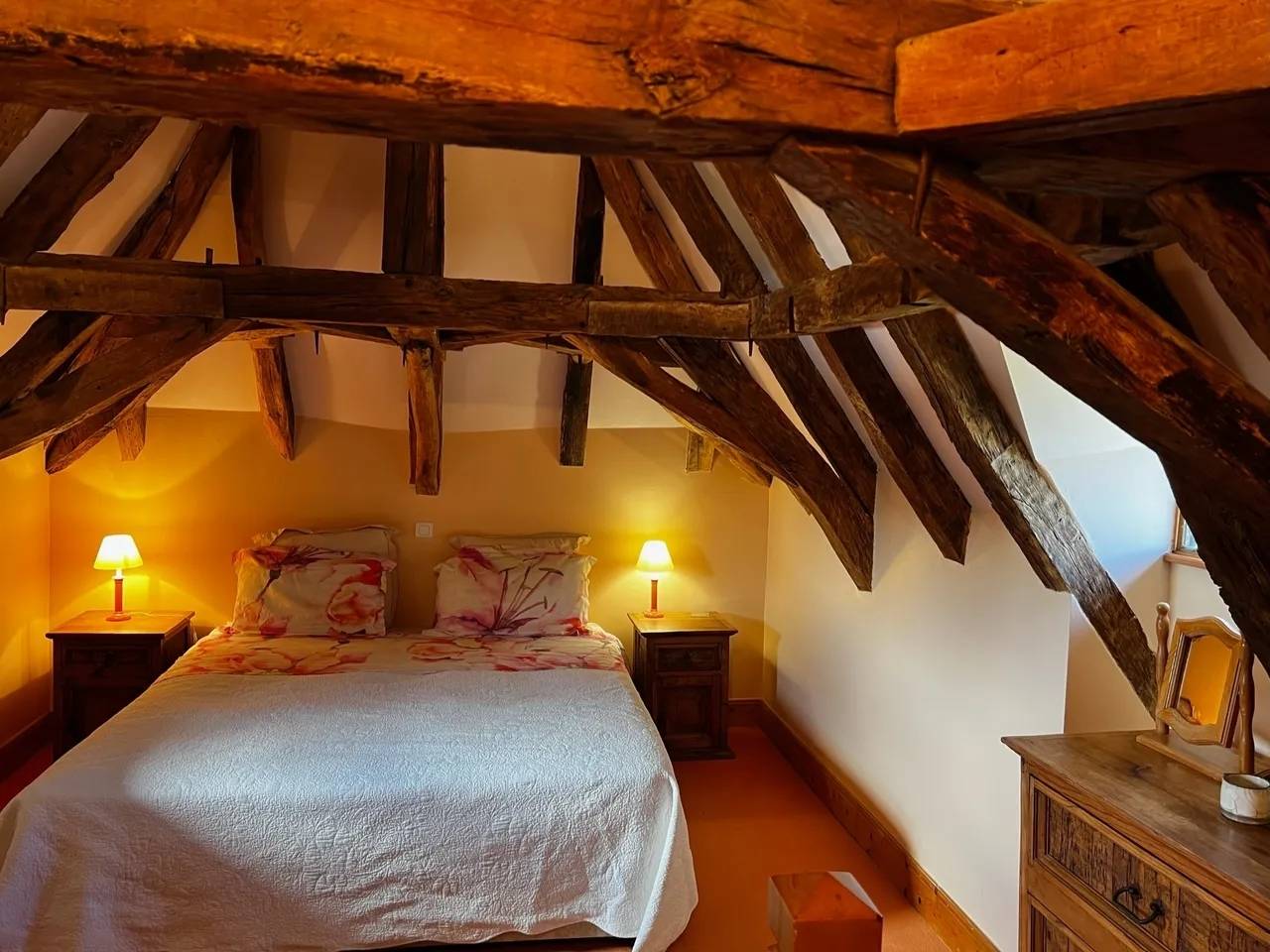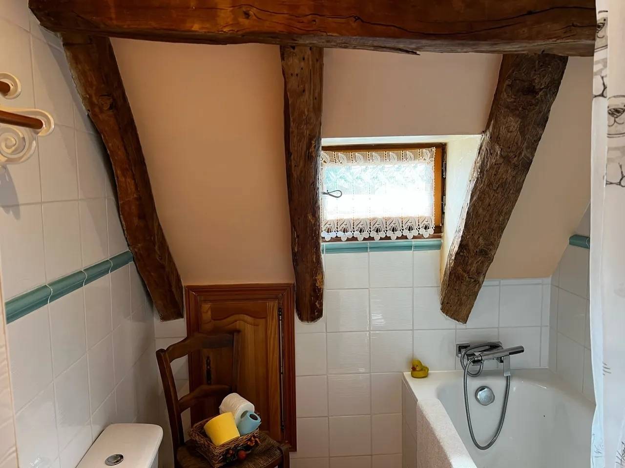 On the ground floor you will find a well equipped kitchen and the living room and dining room and restored fireplace. The dining room chairs and table are antiques from the country. The master bedroom has an excellent quality king size bed, set into the roof slope, with beautiful exposed beams. (Some are low!) From the room you have a view of the pool. The en-suite bathroom has a washbasin, W.C. and bath with integrated shower.