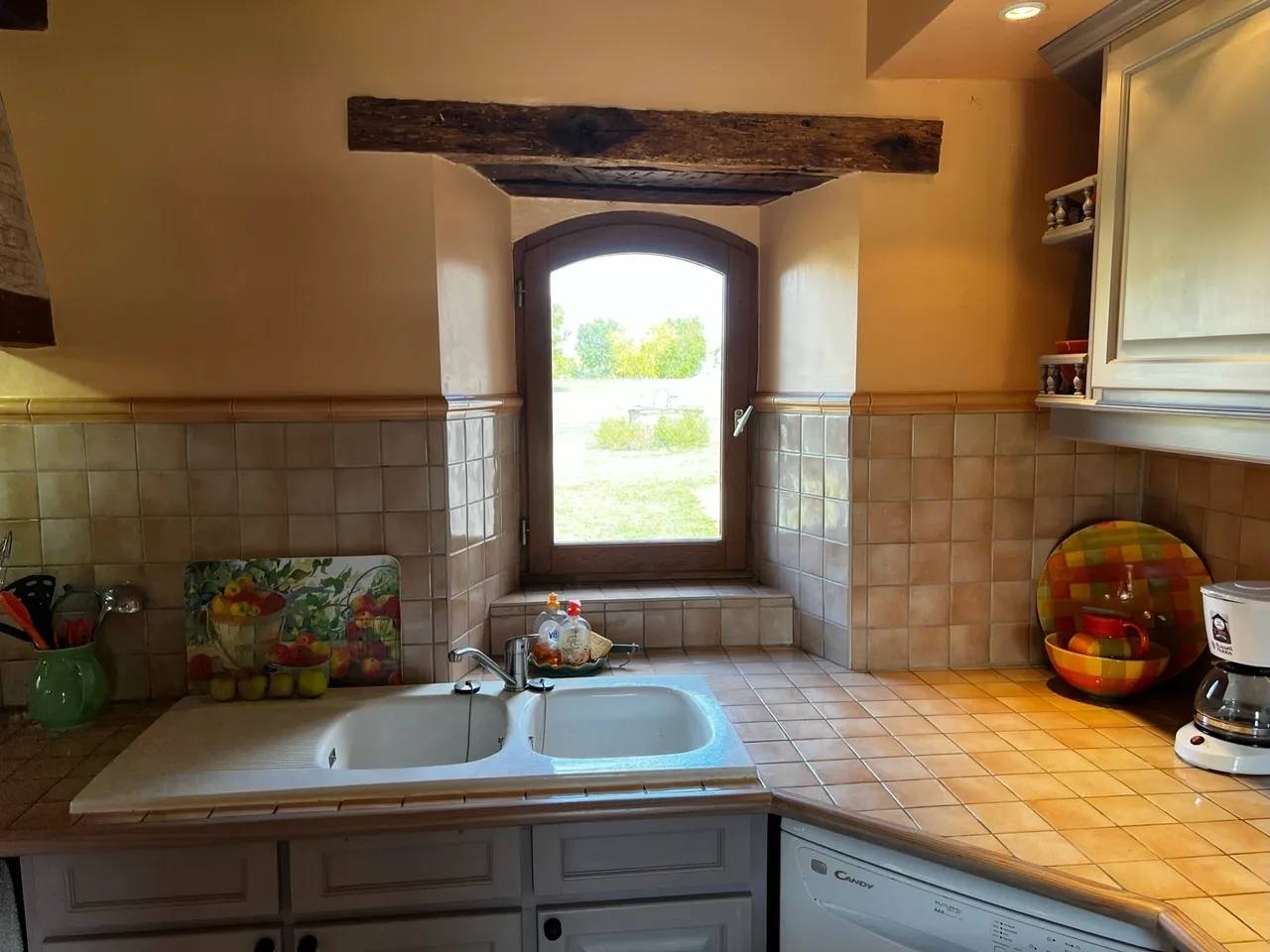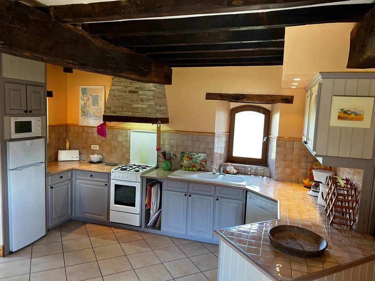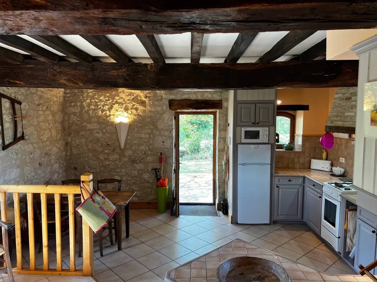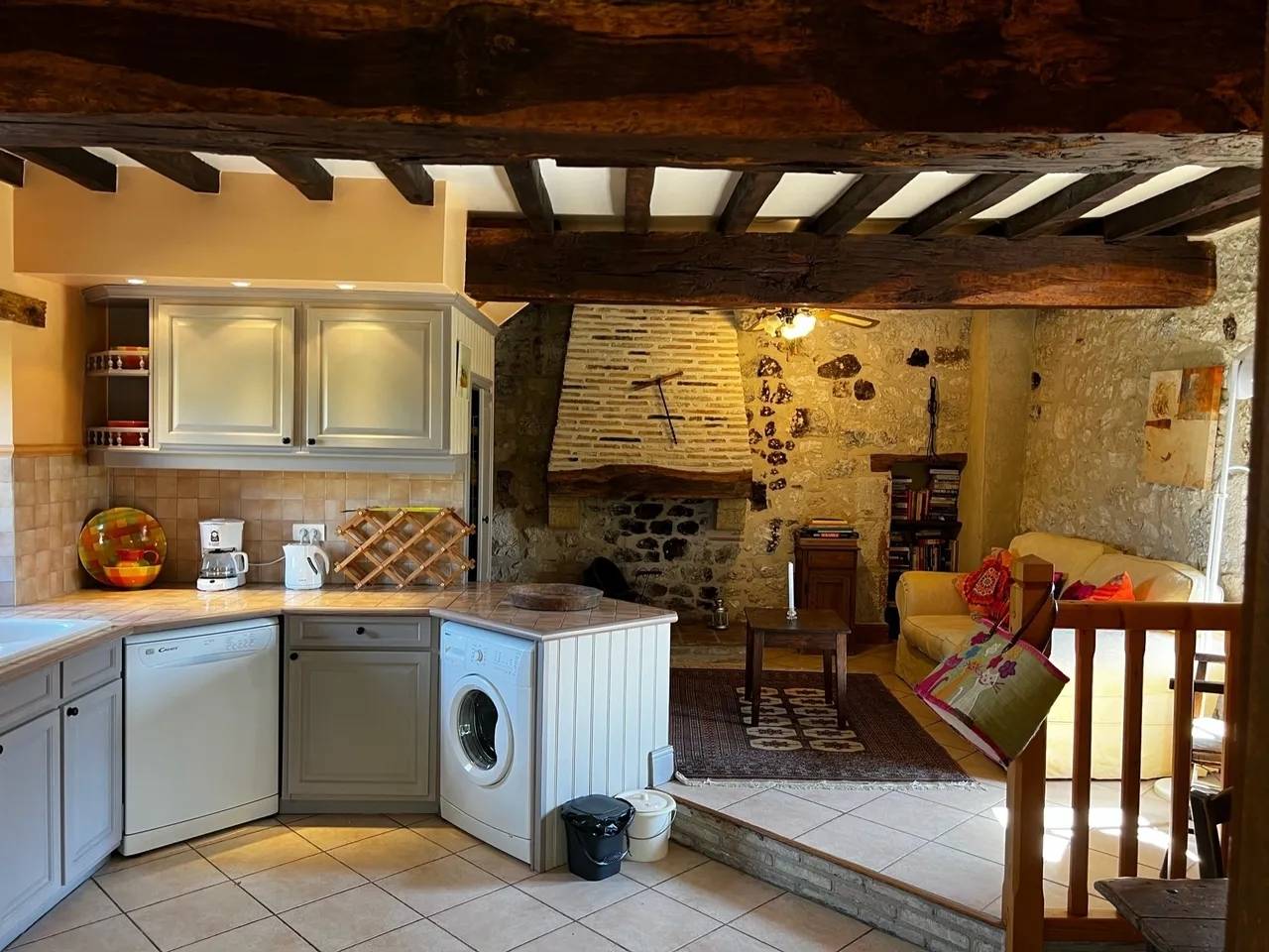 On the ground floor you will find a well equipped kitchen and the living room and dining room and restored fireplace. The dining room chairs and table are antiques from the country. The master bedroom has an excellent quality king size bed, set into the roof slope, with beautiful exposed beams. (Some are low!) From the room you have a view of the pool. The en-suite bathroom has a washbasin, W.C. and bath with integrated shower.