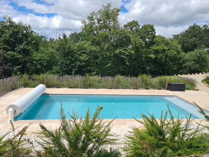 Gite L'Amour is a modern detached holiday home in the Dordogne for 6 people with a heated swimming pool. Through the glass front door you enter a hallway and enter a spacious and bright open living room with high ceilings. The fully equipped modern kitchen, consisting of electric oven and hob, dishwasher, fridge freezer, coffee machine and a large range of crockery and glassware. There is a beautiful solid wooden dining table with 6 chairs. The seating area has a comfortable sofa and armchair and a flat-screen TV. A large French window gives access to the enormous raised terrace and the forest behind it.