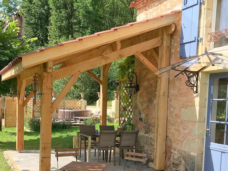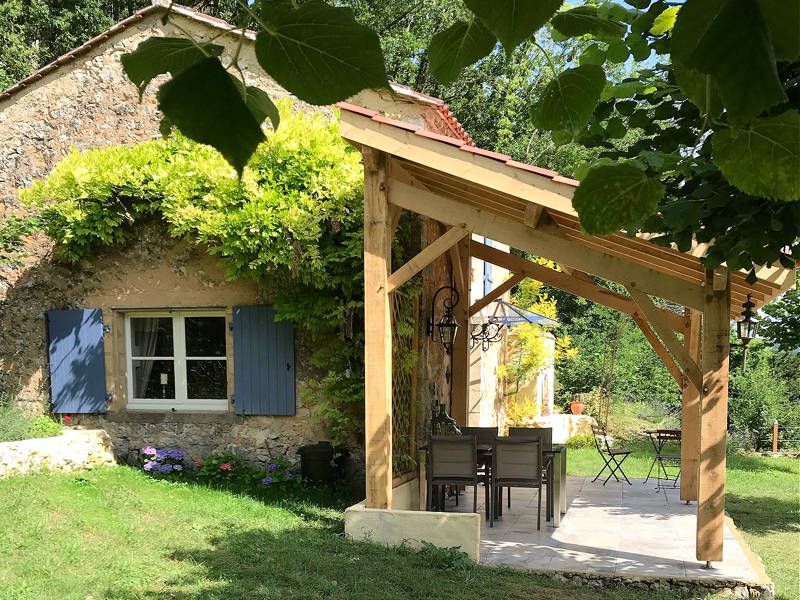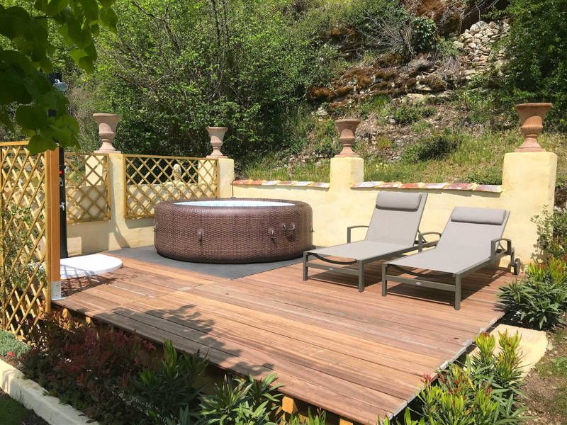 You reach the gite via a fairly steep driveway. Your own parking space is 10 meters lower from the gite, which can be reached via the garden steps. Gite La Petite Chapelle has its own private garden and is located on the grounds of Manoir La Caille d'Or. Due to the sheltered location, naturism in the private garden is possible. There is a spacious covered shaded terrace. The terrace is equipped with garden furniture. From your own private garden you have a beautiful view. The sun terrace is equipped with two comfortable sunbeds, a solar shower and a large jacuzzi.