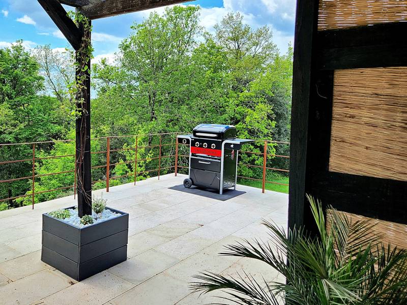 La Trilogie D'or is located on extensive grounds and offers peace and privacy. After a day of exploring, enjoy al fresco dining on our beautiful elevated terrace, which offers panoramic views of the private forest and sparkling pool. The decor provides magical moments, accompanied by the occasional graceful flow of hot air balloons. Having a dual function charcoal or gas BBQ in the tranquil outdoor area is fantastic for al fresco dining! It offers flexibility for different cooking styles, and with a separate outdoor table and chairs for six, it's perfect for outdoor gatherings or family meals. The swimming pool is heated and has salt water with waterfall and outdoor shower. The advantages of the saltwater pool are that you do not have red eyes, itchy skin and a chlorine smell. Enjoy softer, healthier water without chemicals.