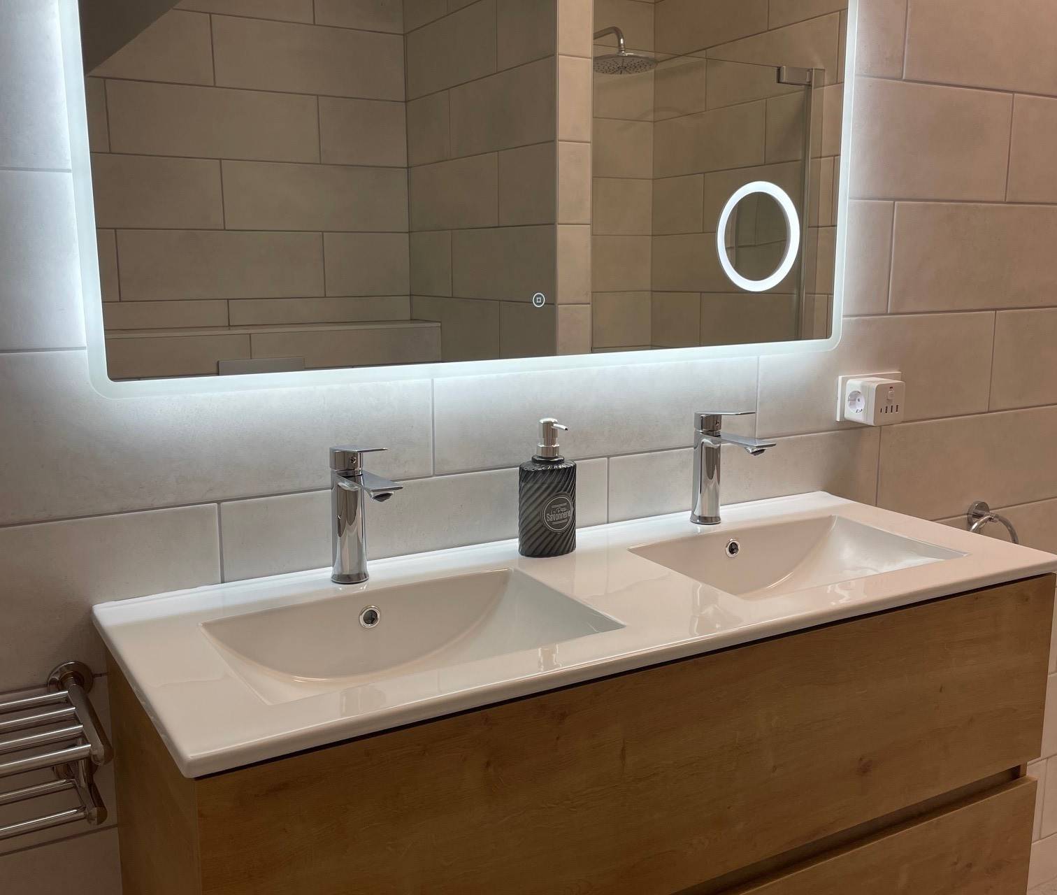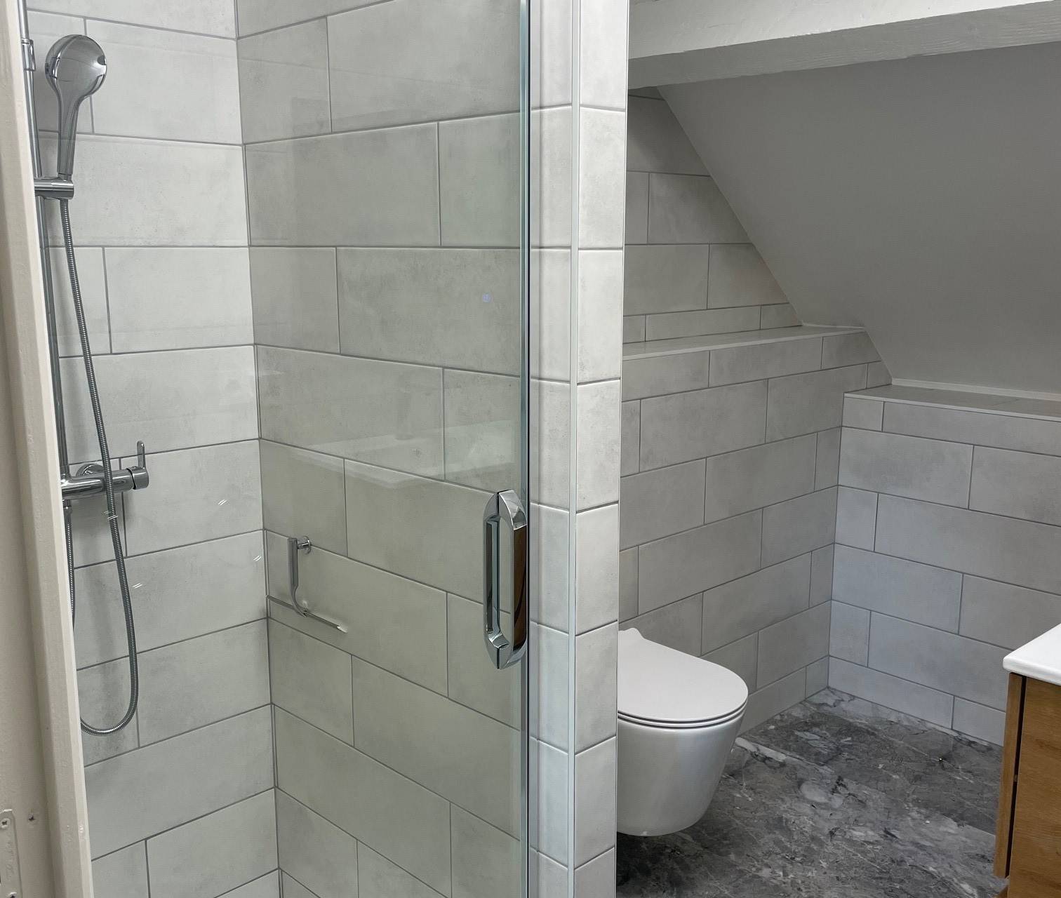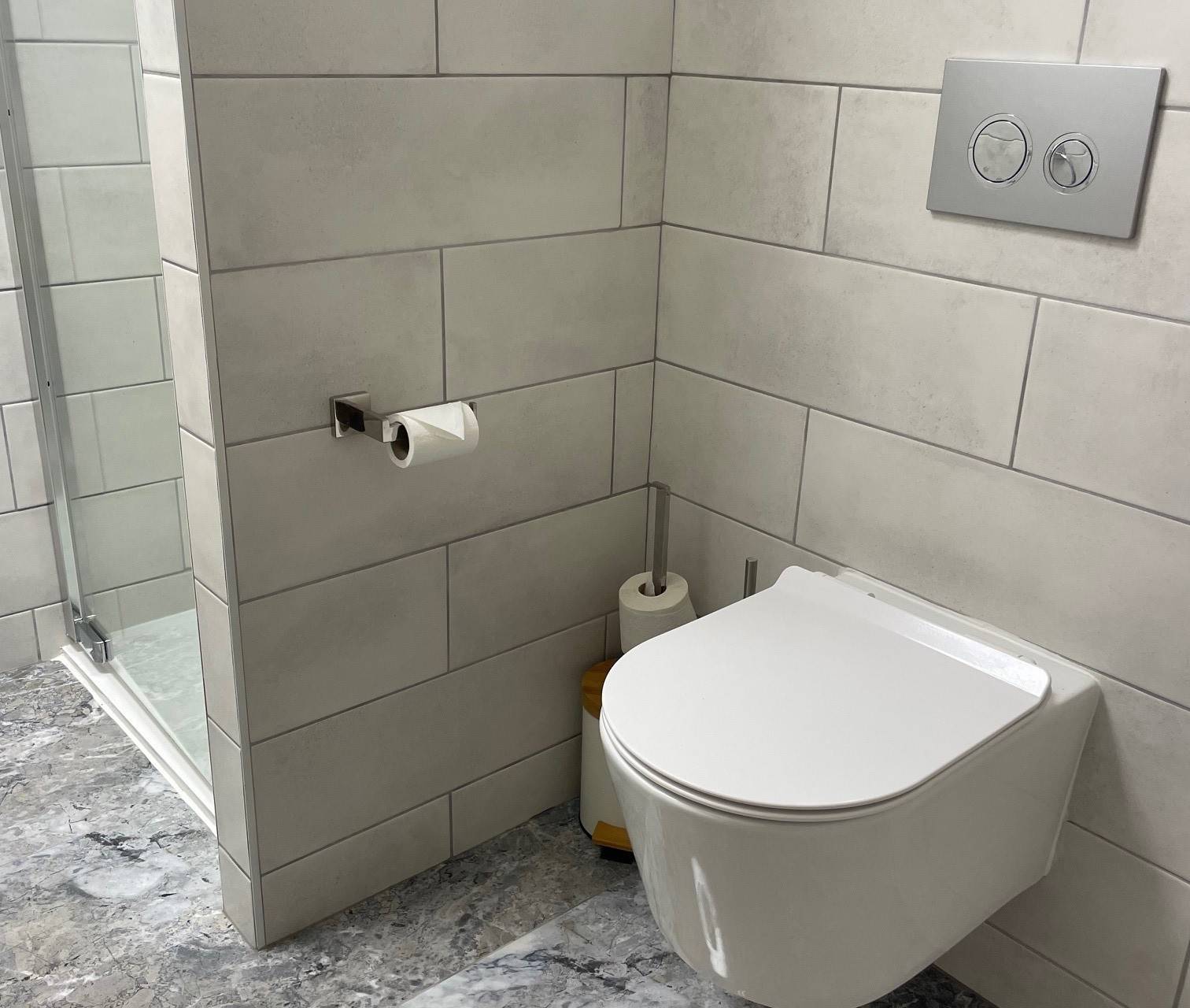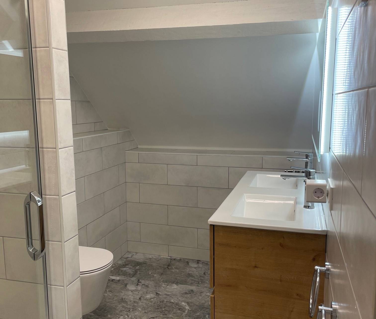 Luxury bathroom with a shower, double vanity, and toilet.