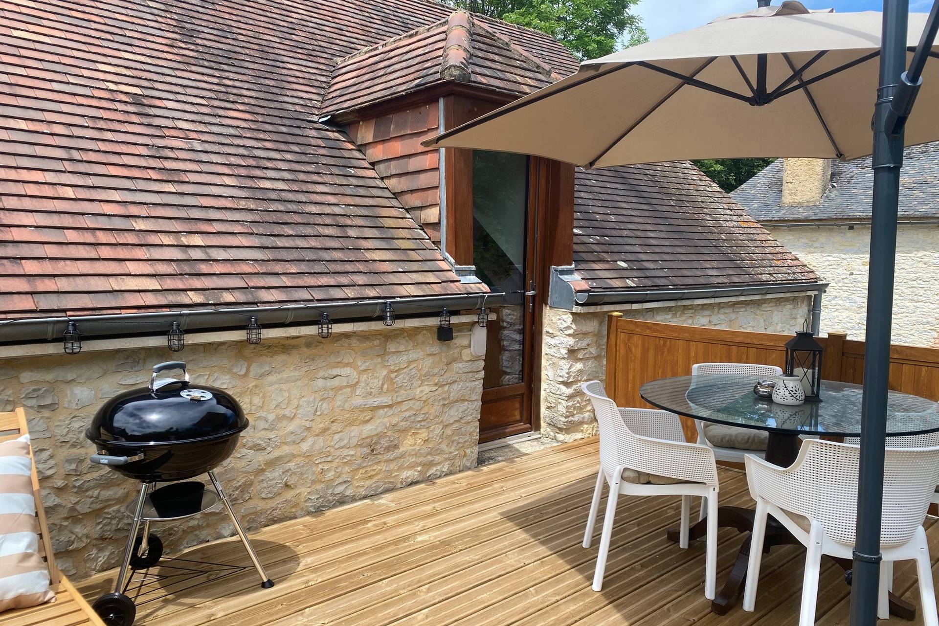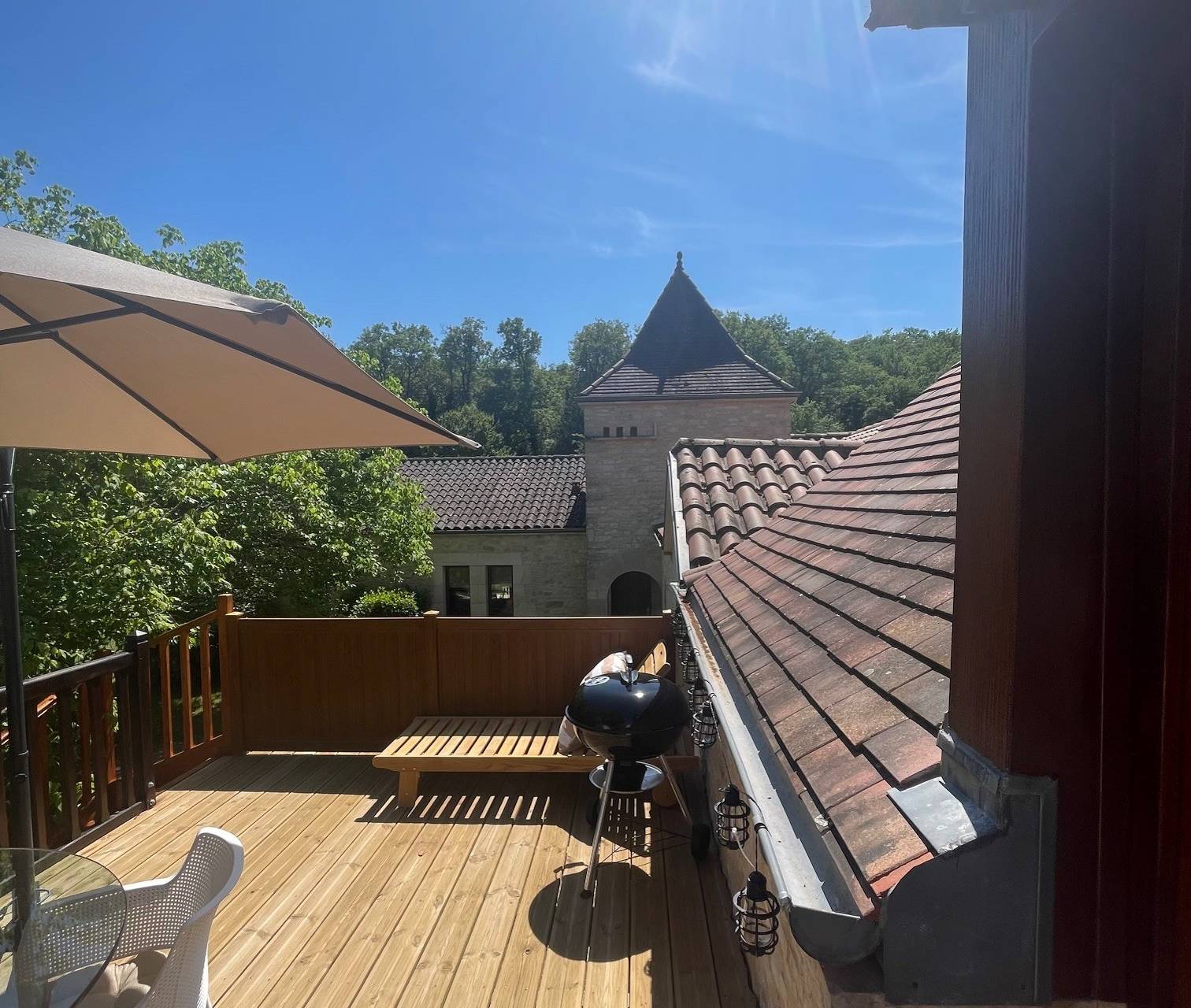 Beautiful terrace with garden furniture, sun loungers, parasol, and BBQ, offering panoramic views of the countryside.