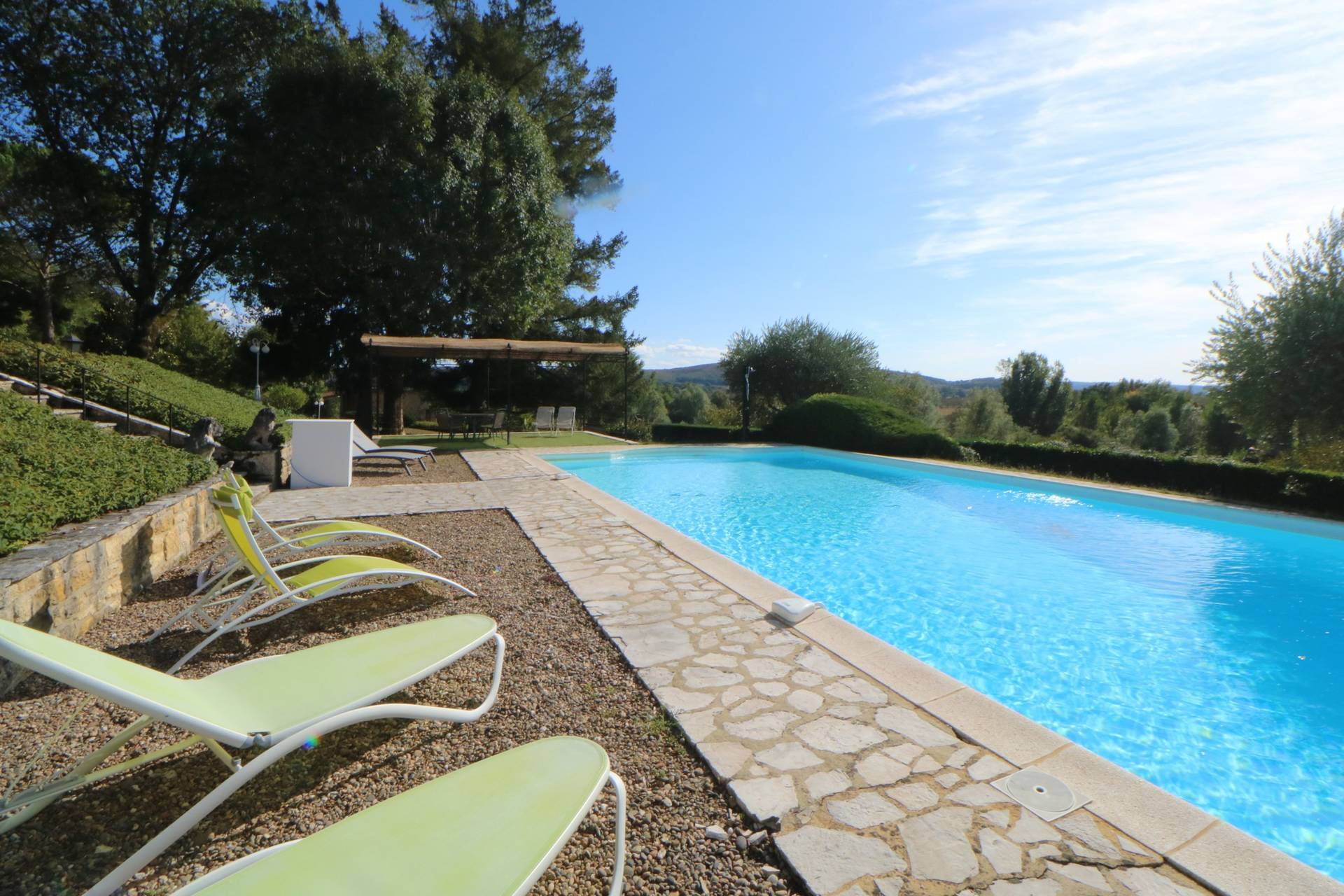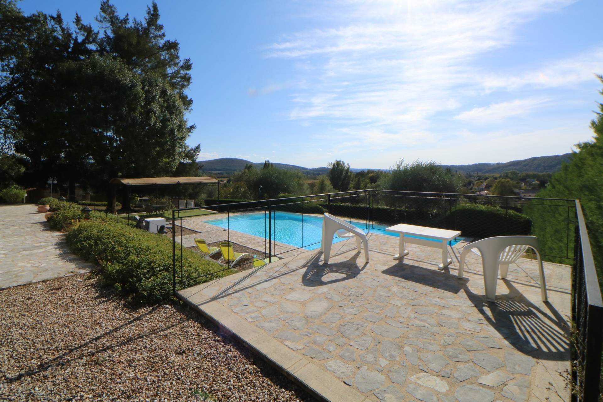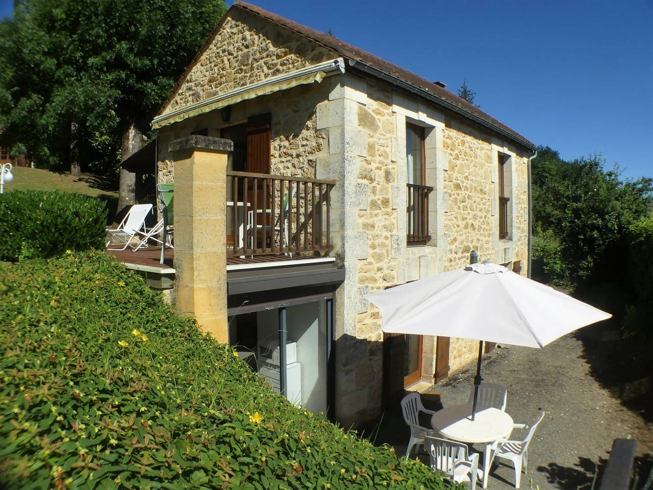 The gite has a lawned garden with flowers. The garden is fully fenced, and pets are welcome. The two terraces, one on the kitchen level and one on the bedroom level, are equipped with a table and chairs and a seating area. The large 14 x 7 meter swimming pool is located on the other side of the garden. It enjoys sunshine from morning until late afternoon. The pool is shared with the owners, whose holiday home is on the same plot. You can park your car right next to the gite.