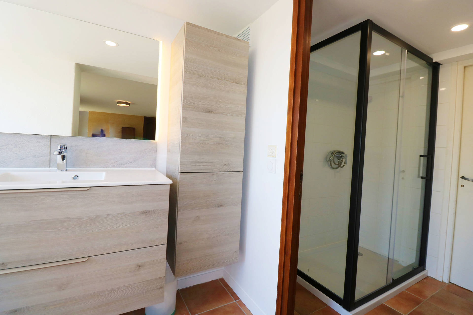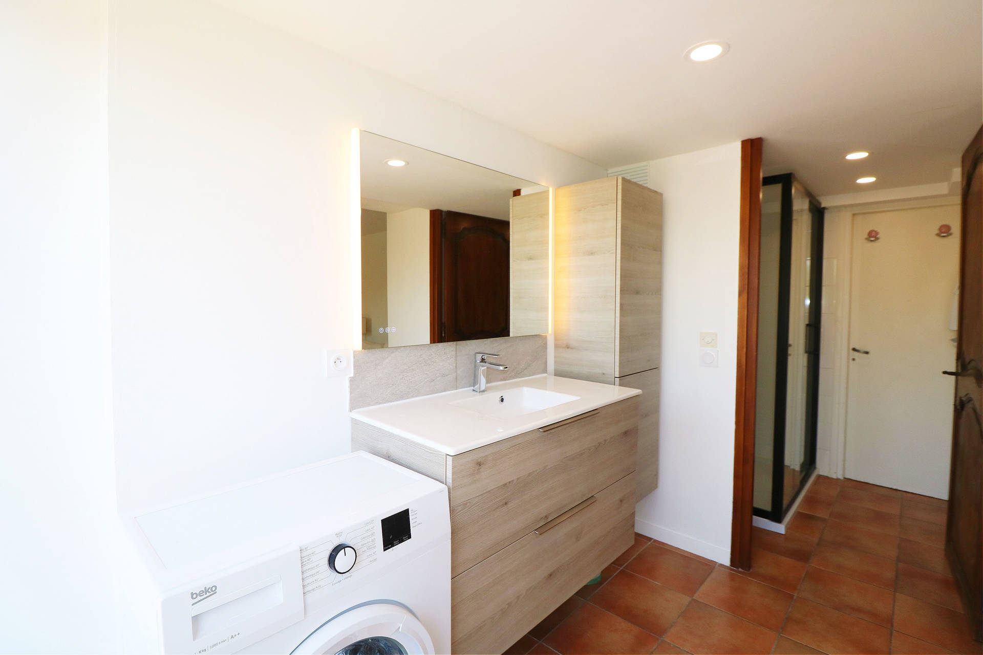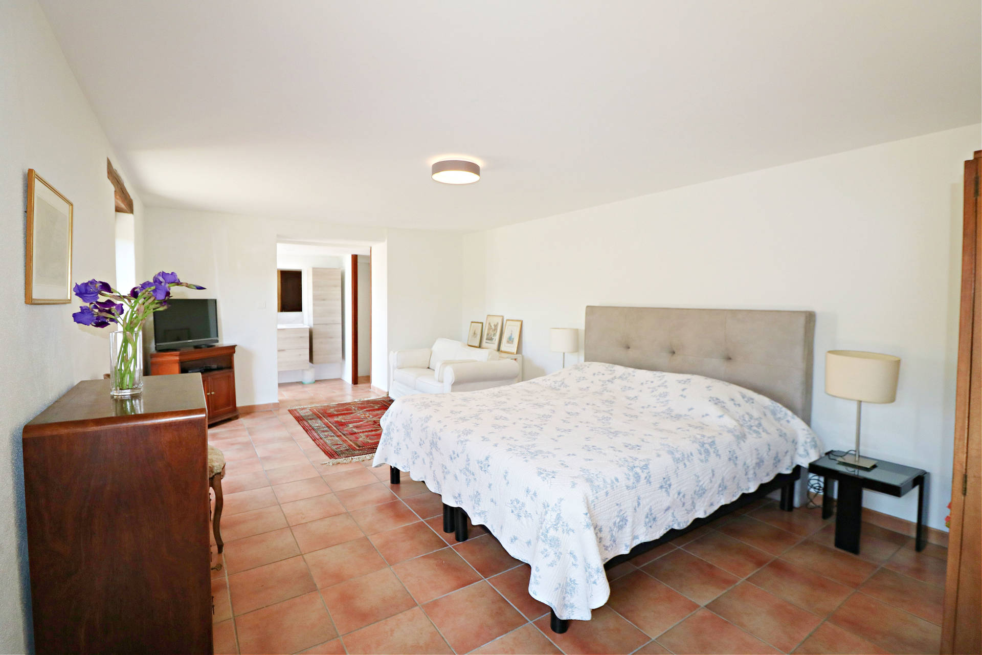 The 30m² bedroom features a new super-king size bed (which can be separated into two single beds), two bedside tables with lamps, a chest of drawers, and two chairs. It has a sitting area with a sofa and a flat-screen TV. Adjacent is the recently renovated bathroom with a spacious walk-in shower, sink, storage space, and a washing machine. There is a separate toilet.