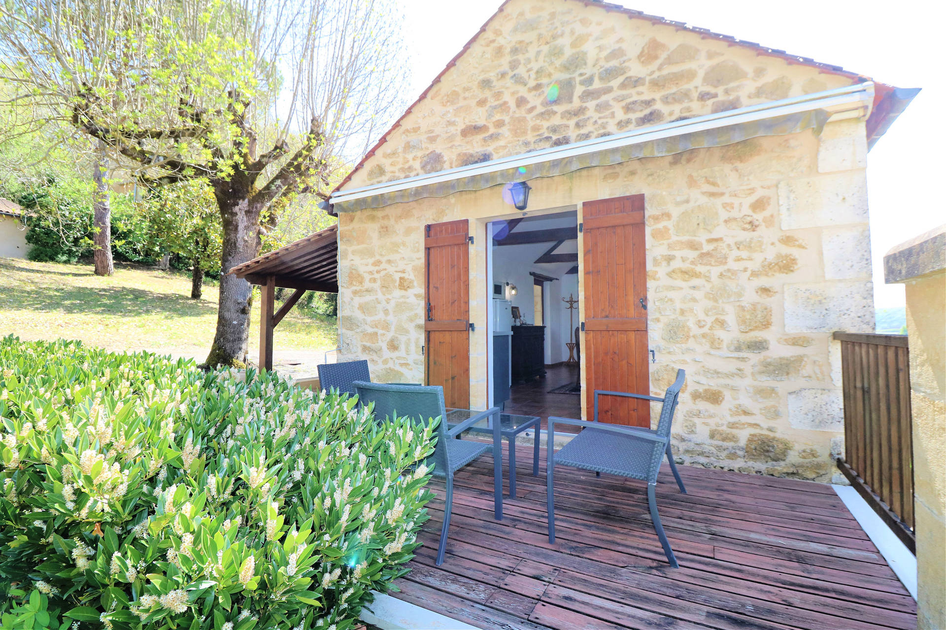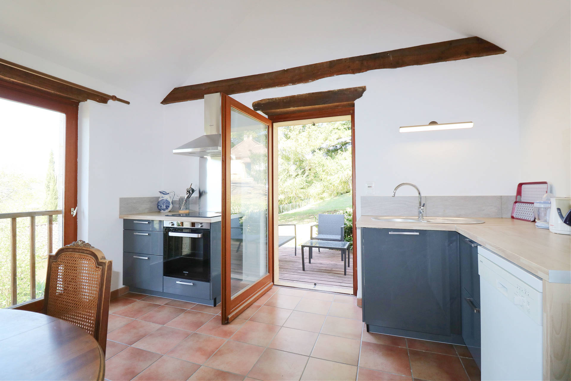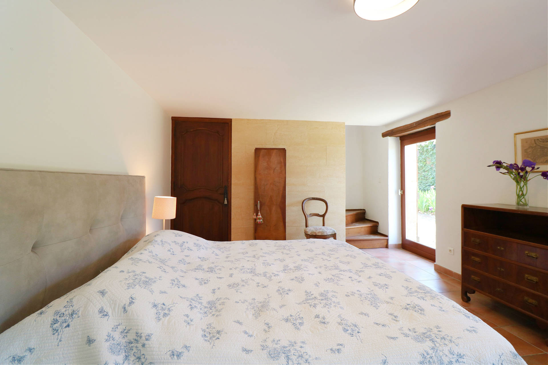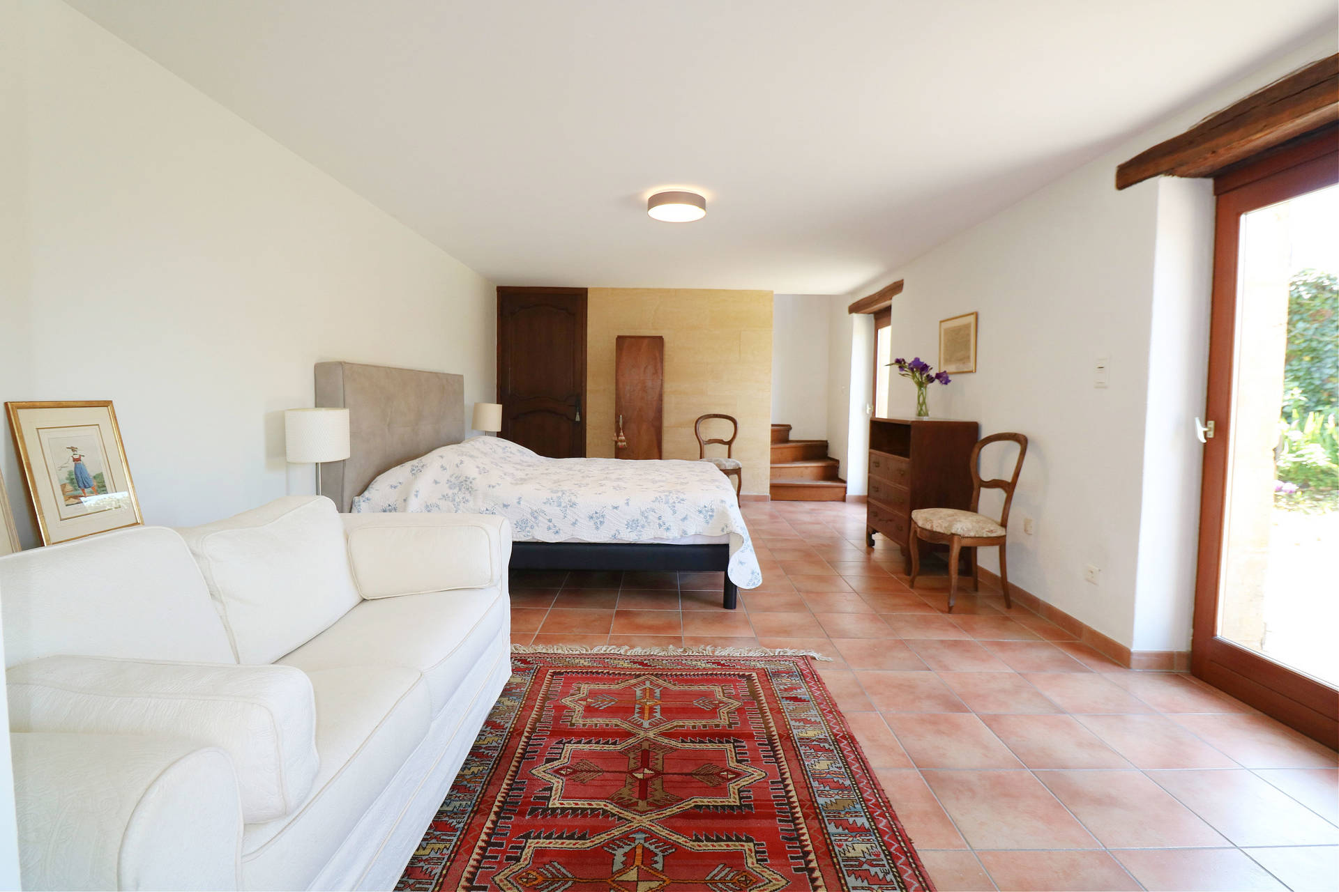 Two large French doors open onto the L-shaped terrace, furnished with a table and chairs, ideal for relaxing outdoors. From the entrance hall, a staircase leads to the lower floor, which remains pleasantly cool in summer.