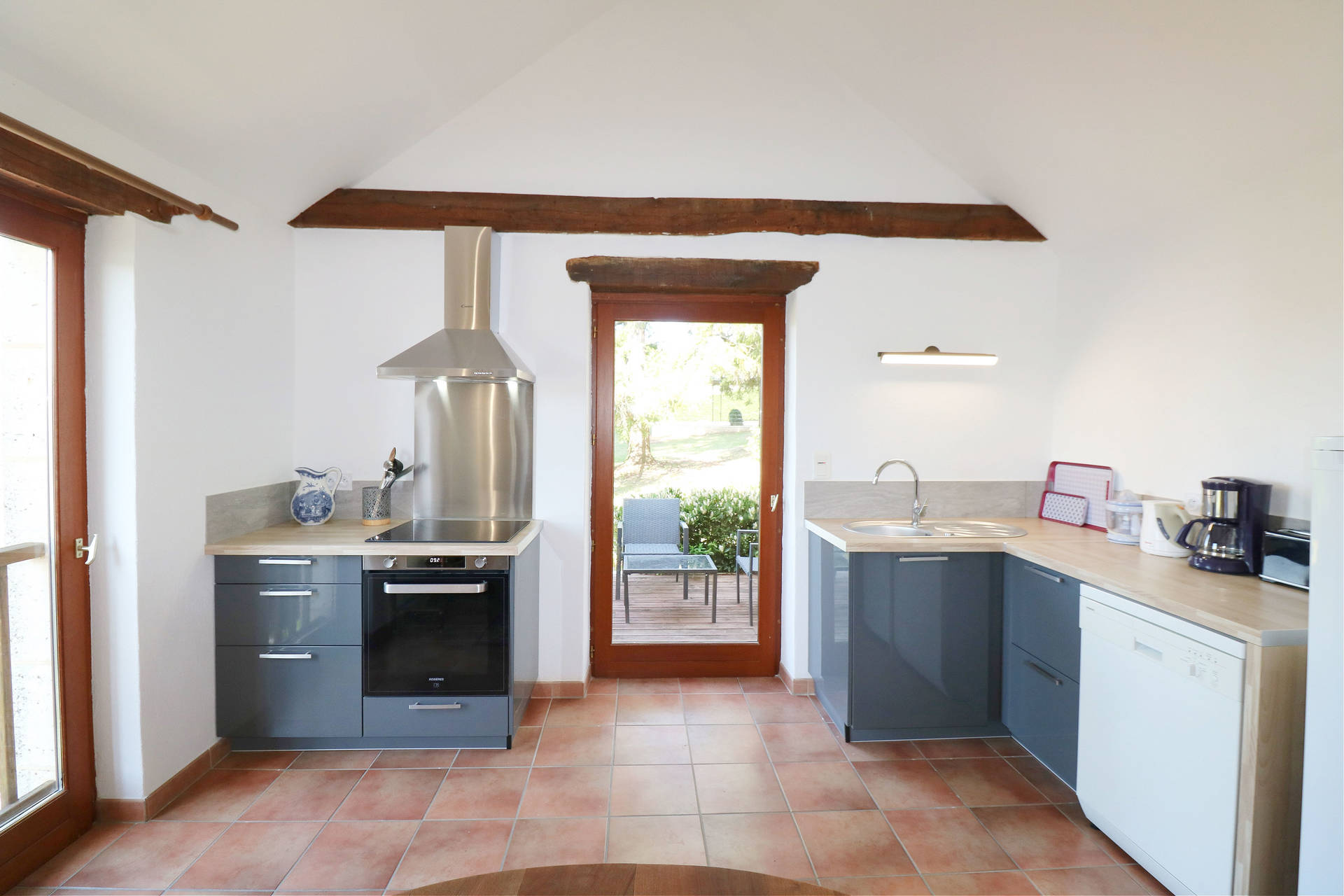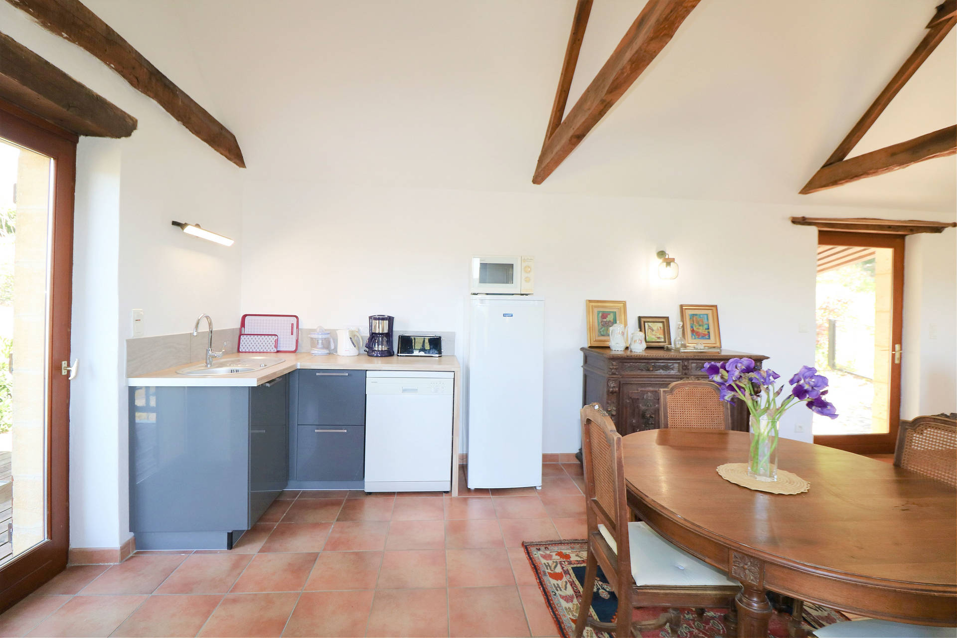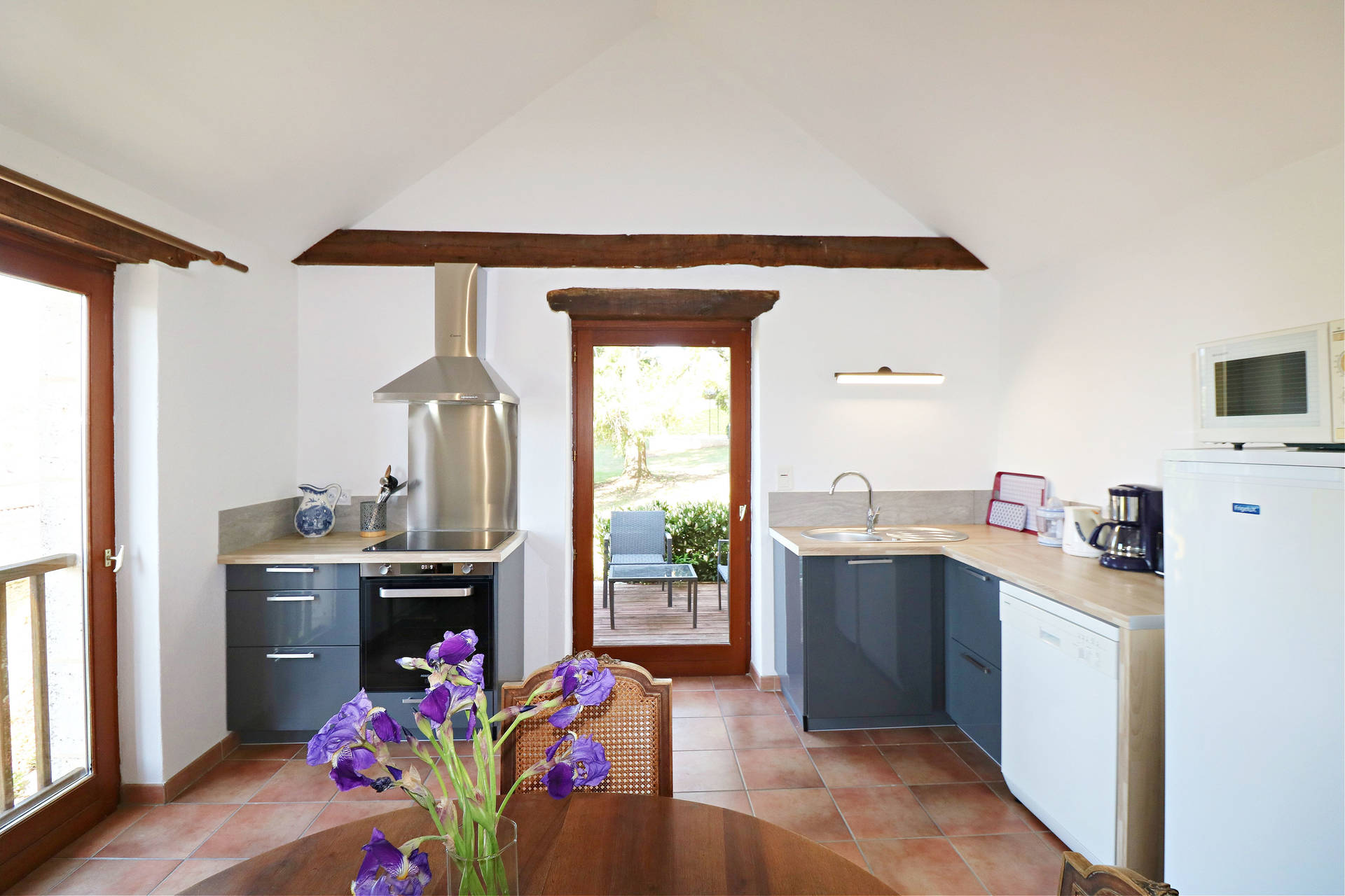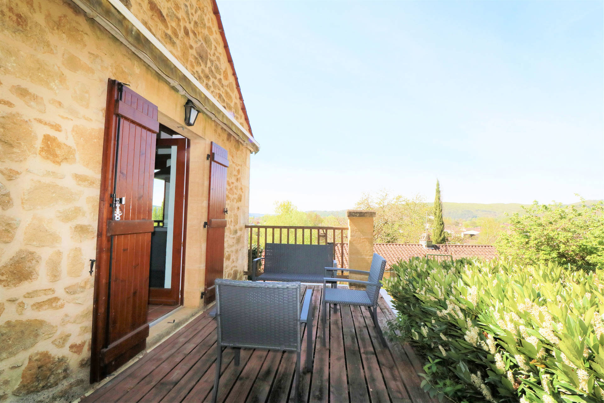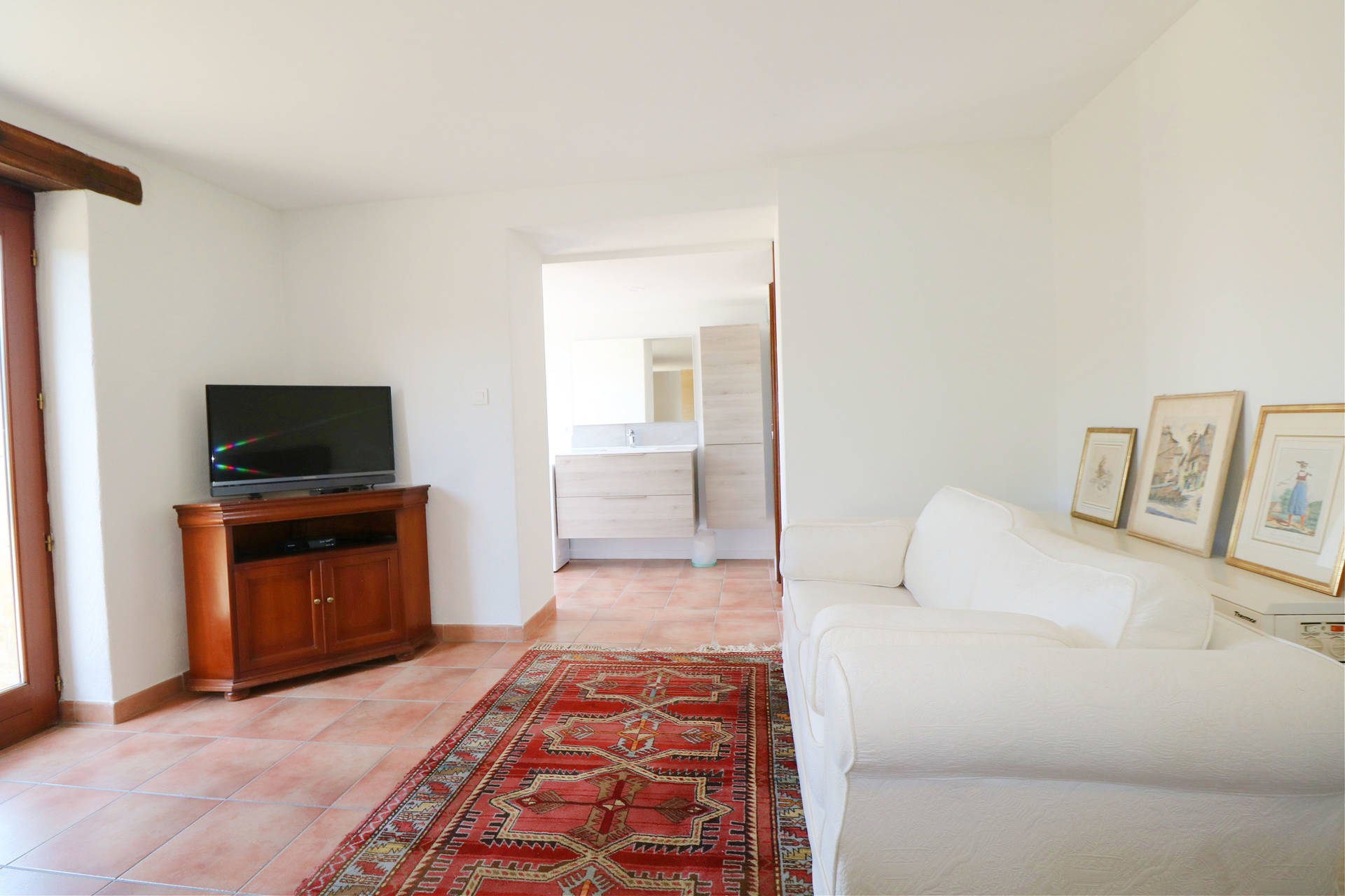 Two large French doors open onto the L-shaped terrace, furnished with a table and chairs, ideal for relaxing outdoors. From the entrance hall, a staircase leads to the lower floor, which remains pleasantly cool in summer.