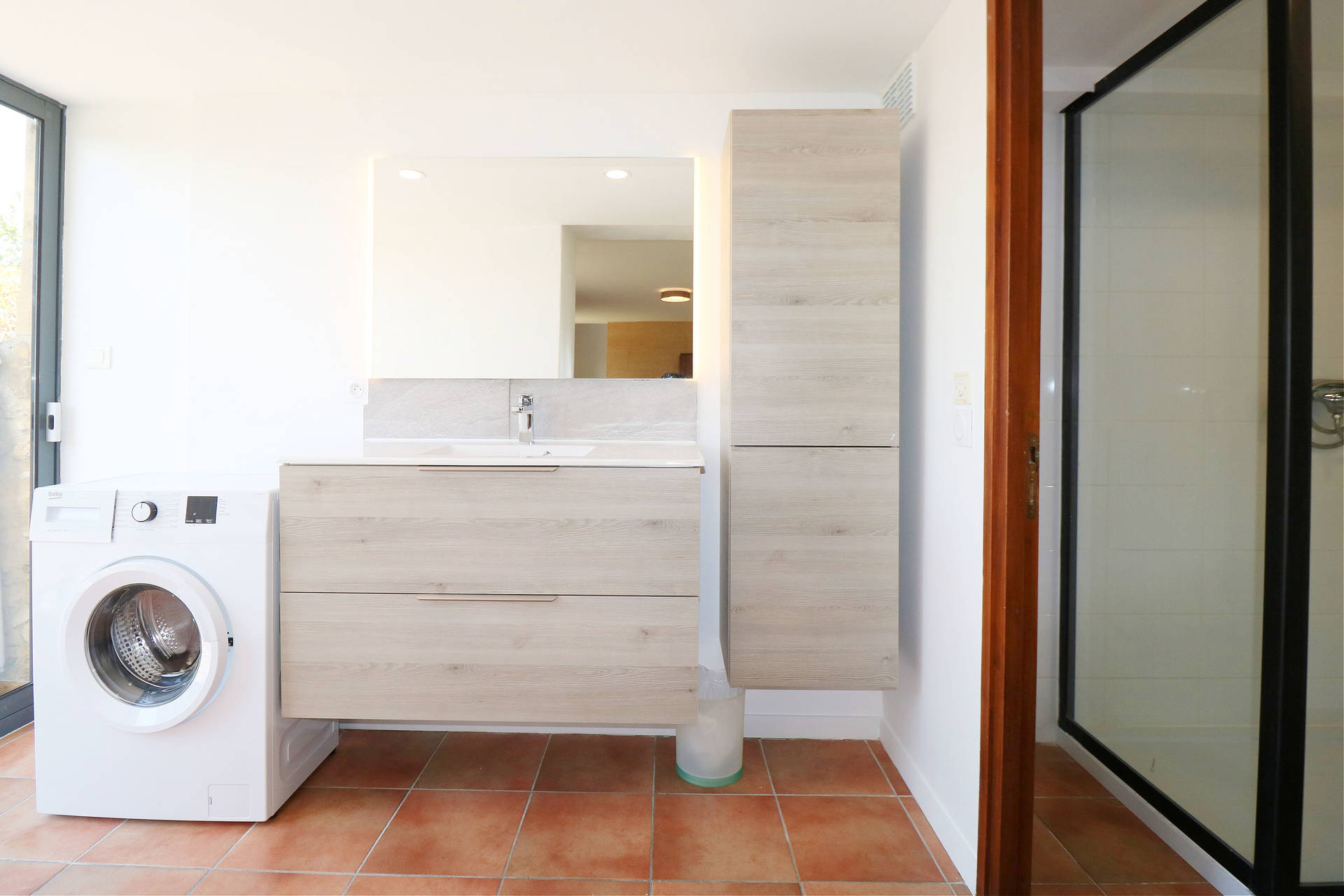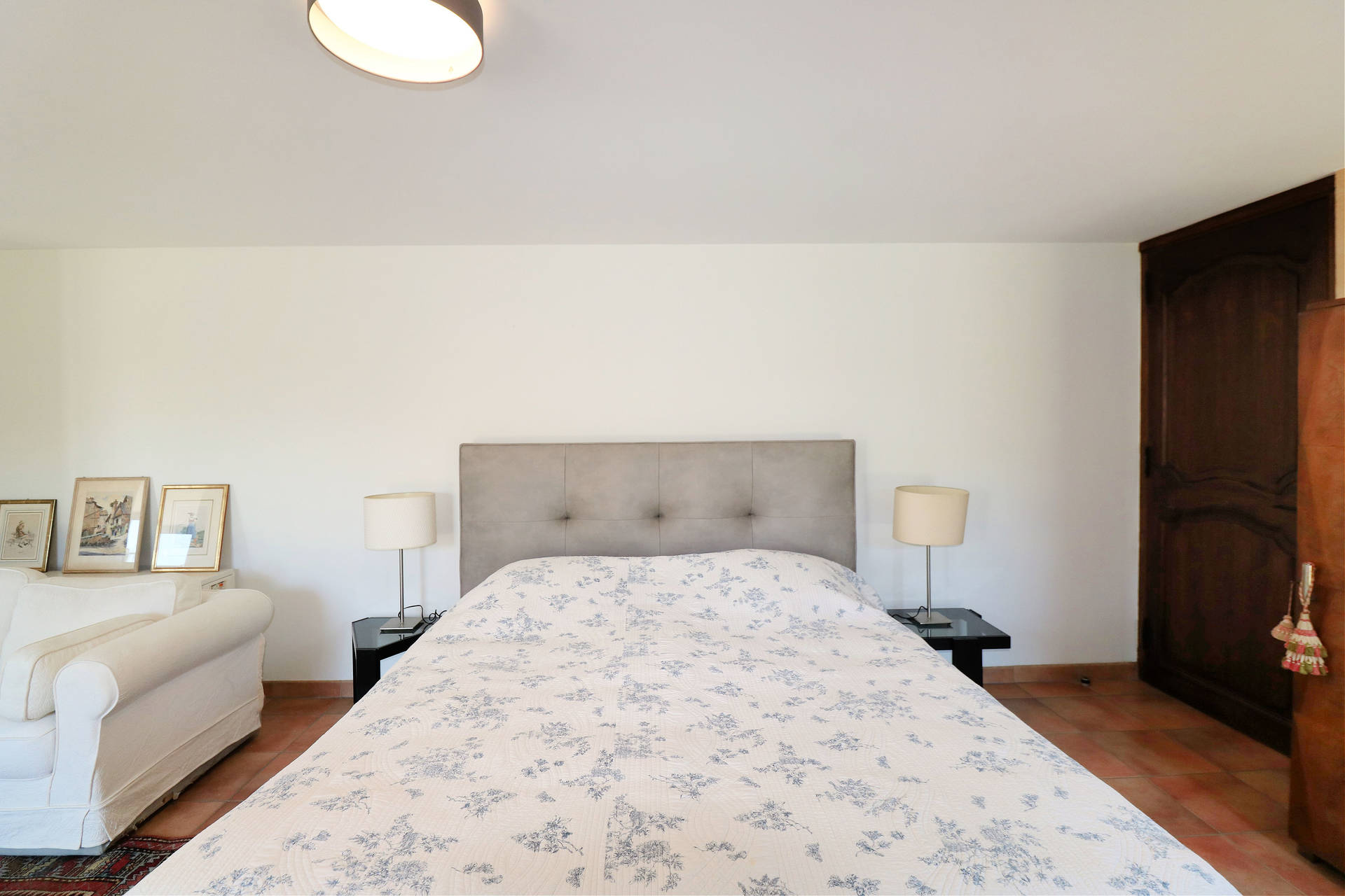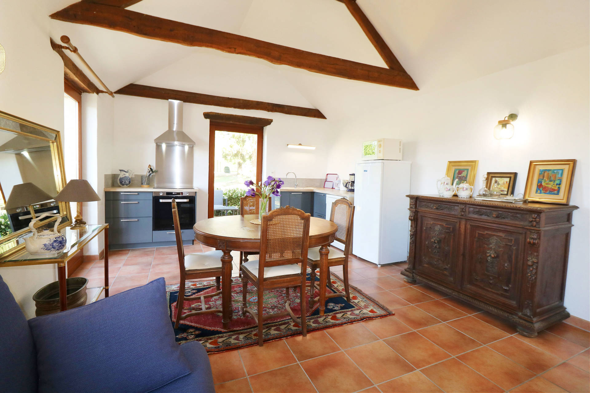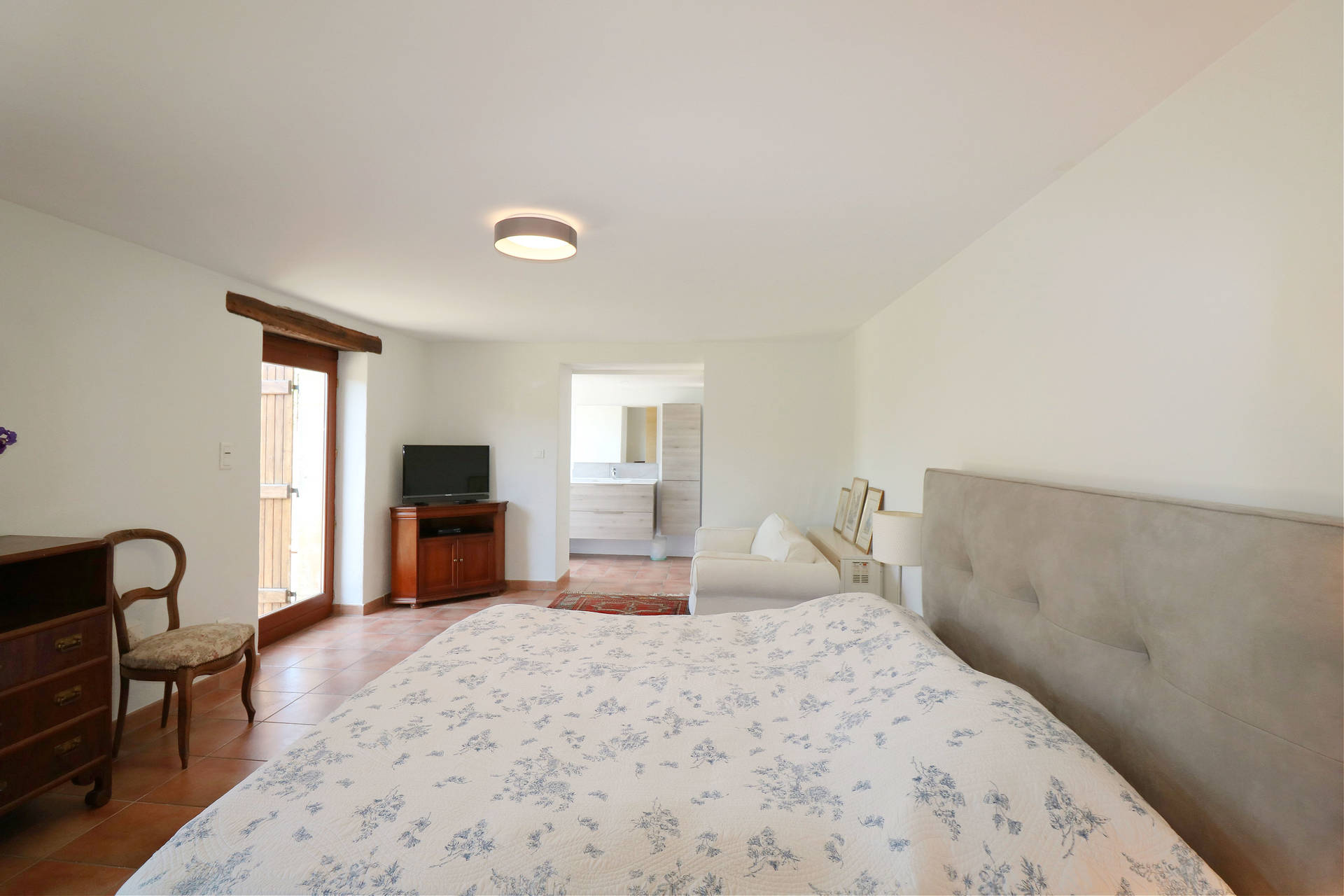 Two large French doors open onto the L-shaped terrace, furnished with a table and chairs, ideal for relaxing outdoors. From the entrance hall, a staircase leads to the lower floor, which remains pleasantly cool in summer.