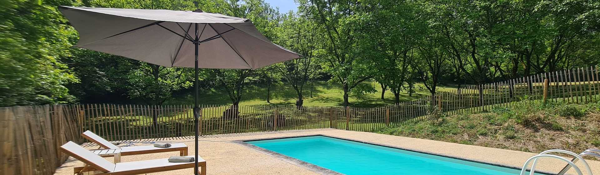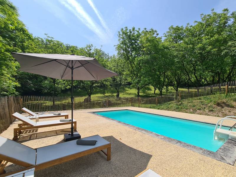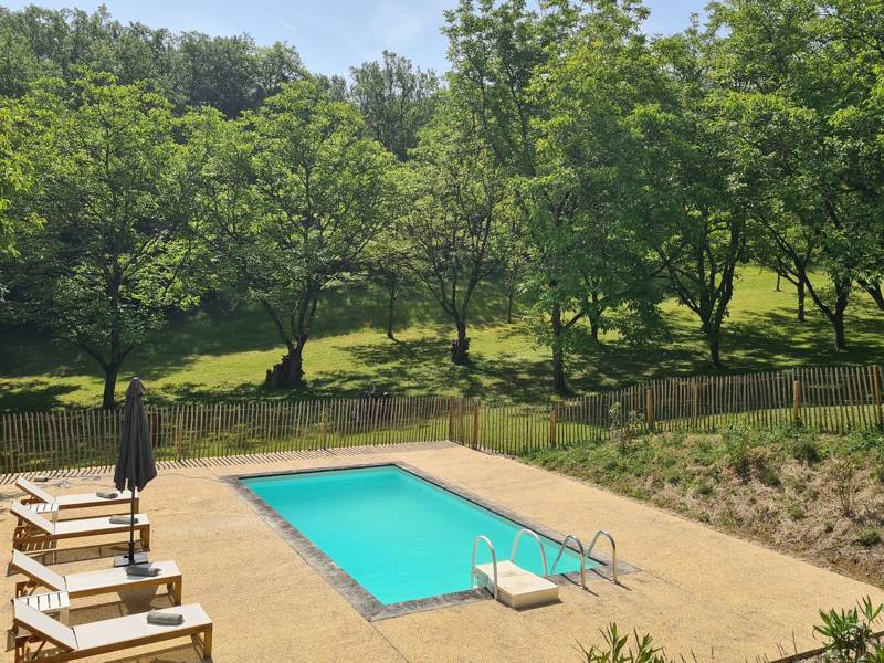 La terrasse avec table et chaises à l'entrée de la maison est idéale pour un coucher de soleil tout en profitant de la vue sur la campagne environnante. La terrasse couverte qui s'étend sur toute la longueur de la maison est équipée de tables et de chaises et d'un barbecue intégré et est idéale pour les repas en plein air lors des chaudes journées d'été ou des soirées plus fraîches. Le Domaine de la Dame dispose d'une belle piscine privée mesurant 7 m x 3,5 m et située en contrebas de la maison. Des chaises longues, des parasols, des tables à boissons et d'autres sièges sont à votre disposition autour de la piscine. Le grand jardin est doté de pelouses, idéales pour les jeux de ballon. Il y a un parking pour plusieurs voitures au bout de la route privée.