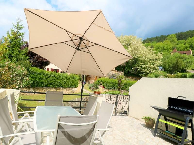 La terrasse est équipée d'une table de jardin, de six chaises et d'un grand barbecue à gaz pour la cuisine et les repas en plein air.
