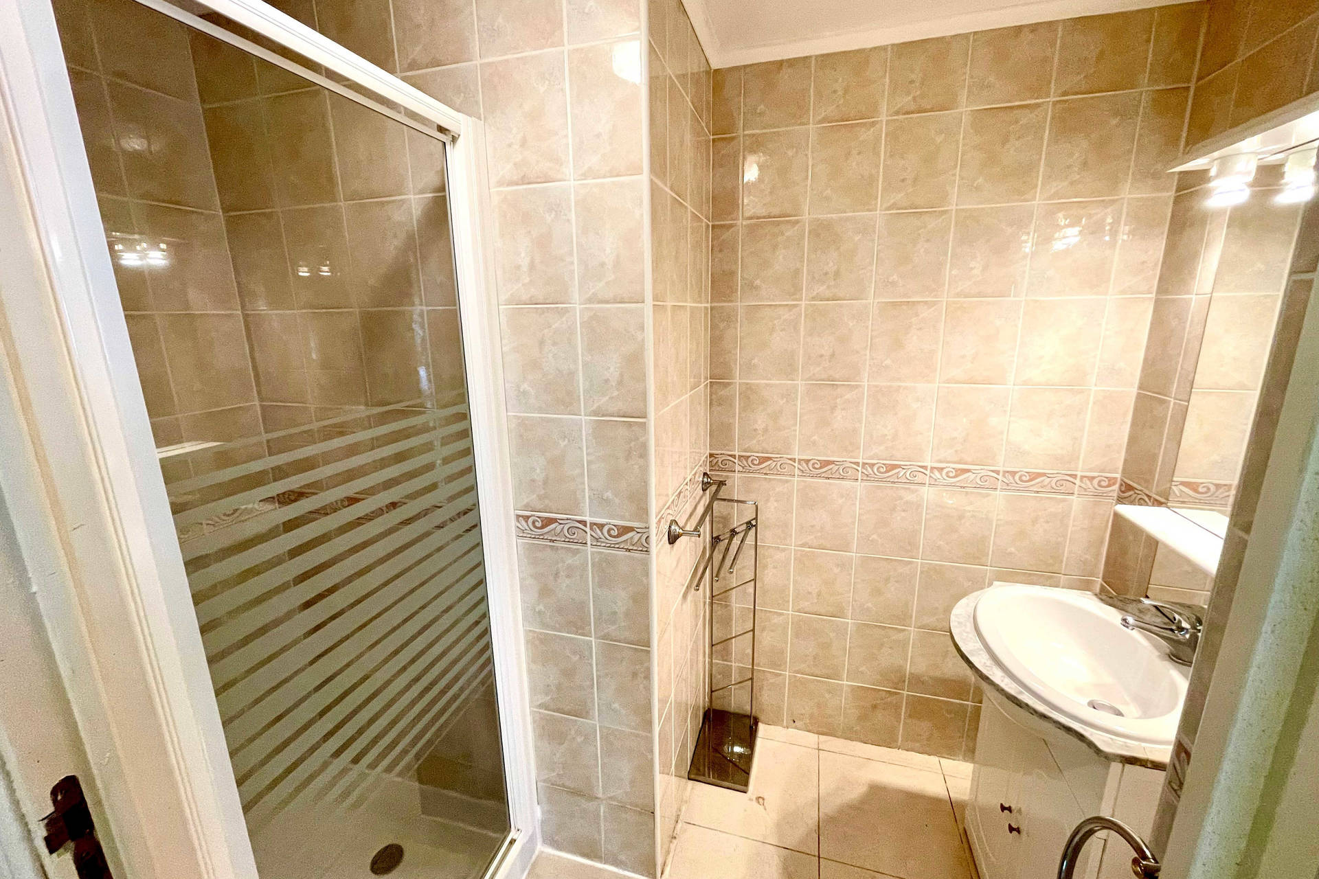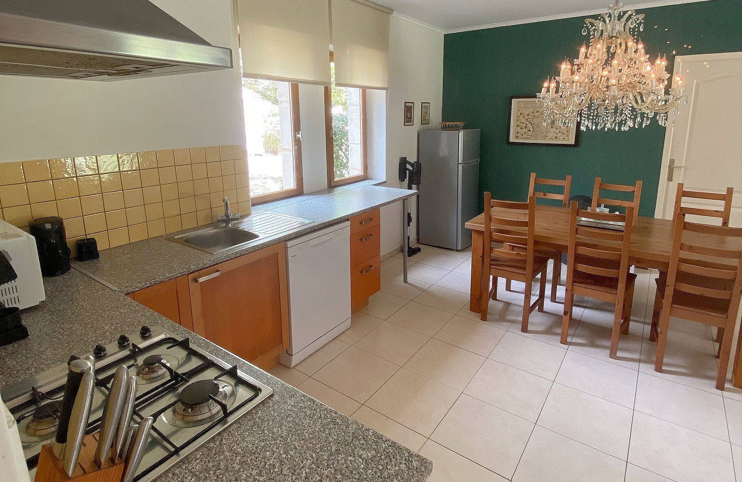 Rez de chaussée : Salon/cuisine avec plaque à gaz, micro-ondes, réfrigérateur, lave-vaisselle, cafetière, grille-pain, etc.. TV couleur et lecteur DVD. Salle d’eau, tout confort avec douche et lavabo. W.C. indépendant.