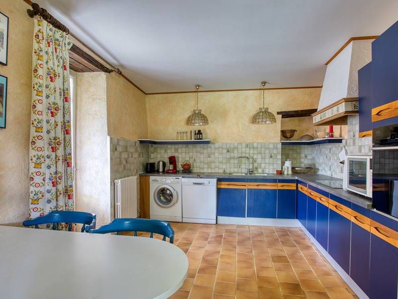 Cuisine entièrement équipée avec 4 plaques de cuisson, grand réfrigérateur-congélateur, lave-vaisselle, four, micro-ondes, cafetière, bouilloire, grille-pain, lave-linge et coin repas. La belle pièce à vivre dispose d'une cheminée, d'un joli plafond aux poutres apparentes et est divisée en deux zones et offre un coin salon (canapé, fauteuils, tables basses, TV) et un coin repas avec une grande table en chêne massif et 8 chaises pour les repas à l'intérieur. Il y a un total de 4 chambres. La chambre 1 est située au rez-de-chaussée