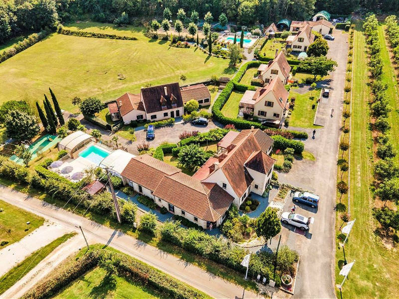Petit parc de vacances adapté aux enfants avec piscine, aire de jeux et climatisation en Dordogne.