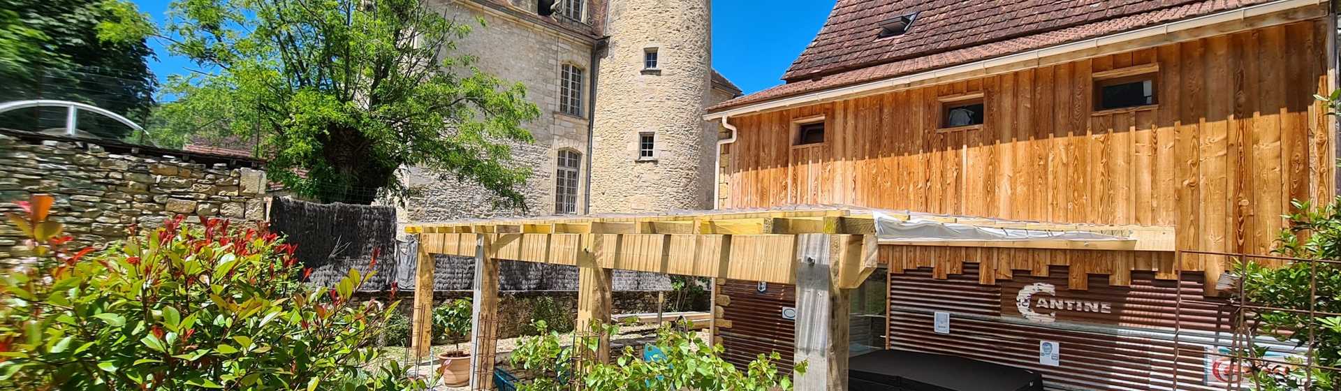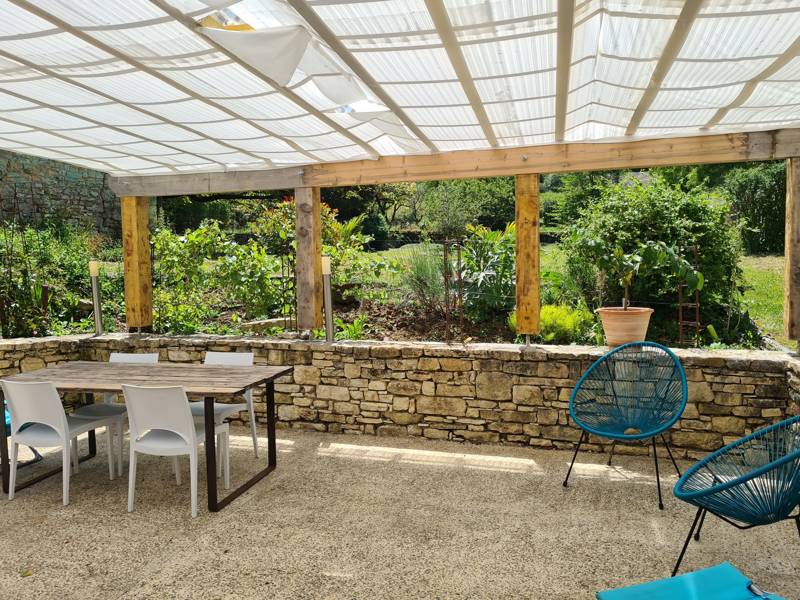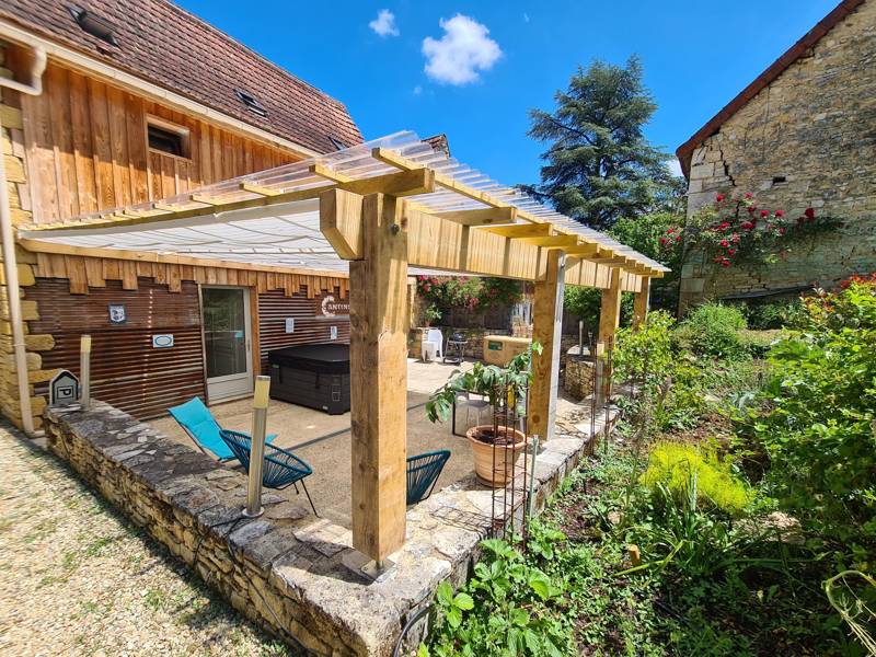 Derrière le Gîte Neabout Daglan se trouve une grande terrasse privée de 60 m² avec un immense jacuzzi, disponible d'avril à octobre. La terrasse est couverte et équipée d'une table et de chaises et d'un barbecue au charbon de bois pour manger en plein air. Le grand jardin est entièrement clôturé et il y a une place de parking privée juste devant le bâtiment.