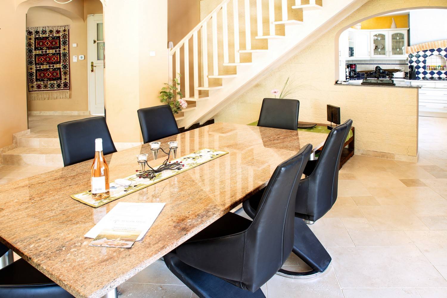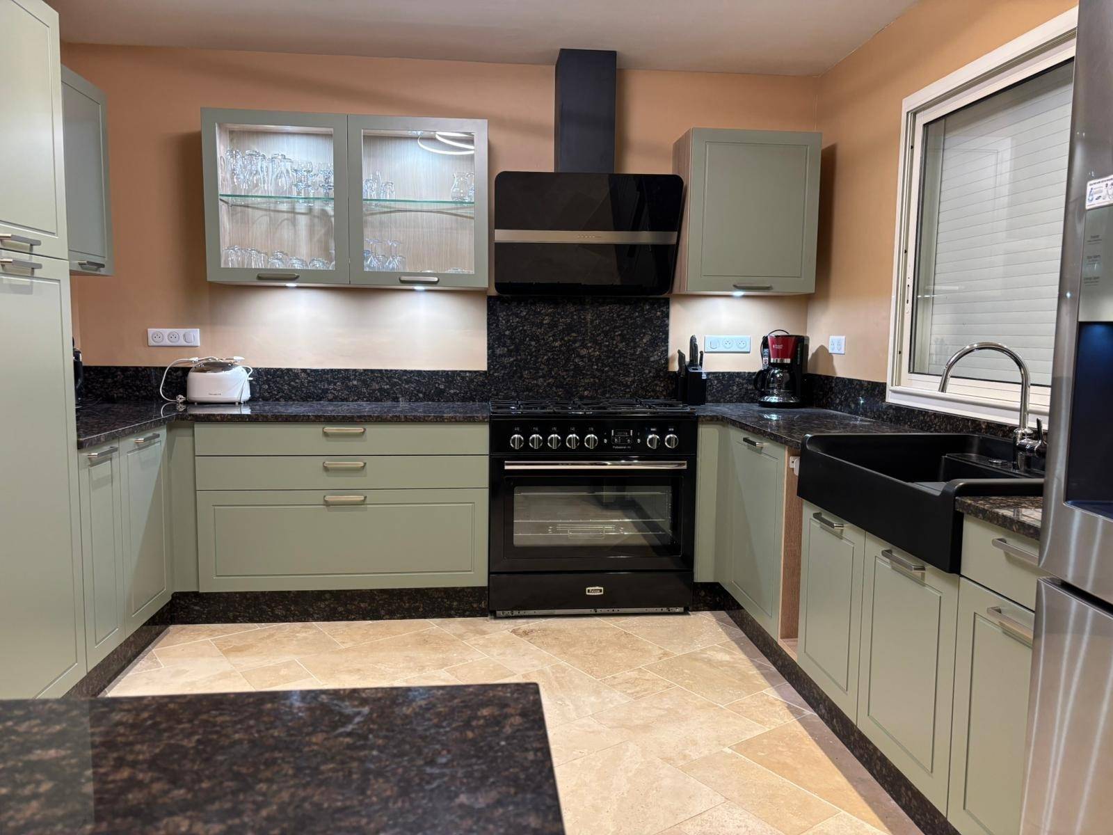 Il y a une grande salle à manger avec une cuisine et un salon (climatisé) avec cheminée, grande TV, bibliothèque et accès aux terrasses et à la piscine. L'ameublement se compose d'un mélange de meubles anciens et modernes qui créent une atmosphère attrayante. La cuisine de campagne française traditionnelle donne un accès direct à la terrasse avec le barbecue. La cuisine est également équipée d'un grand réfrigérateur américain, d'un lave-vaisselle, d'une buanderie séparée avec réfrigérateur à vin, d'un lave-linge et d'un sèche-linge.
