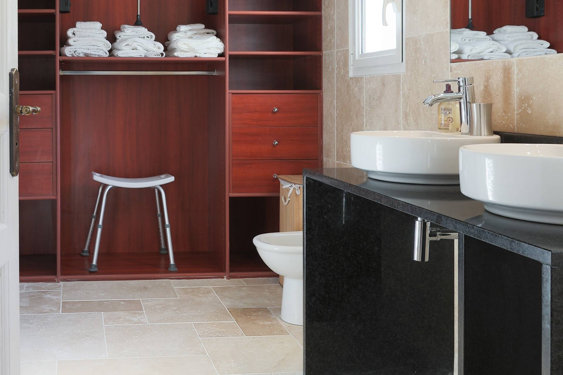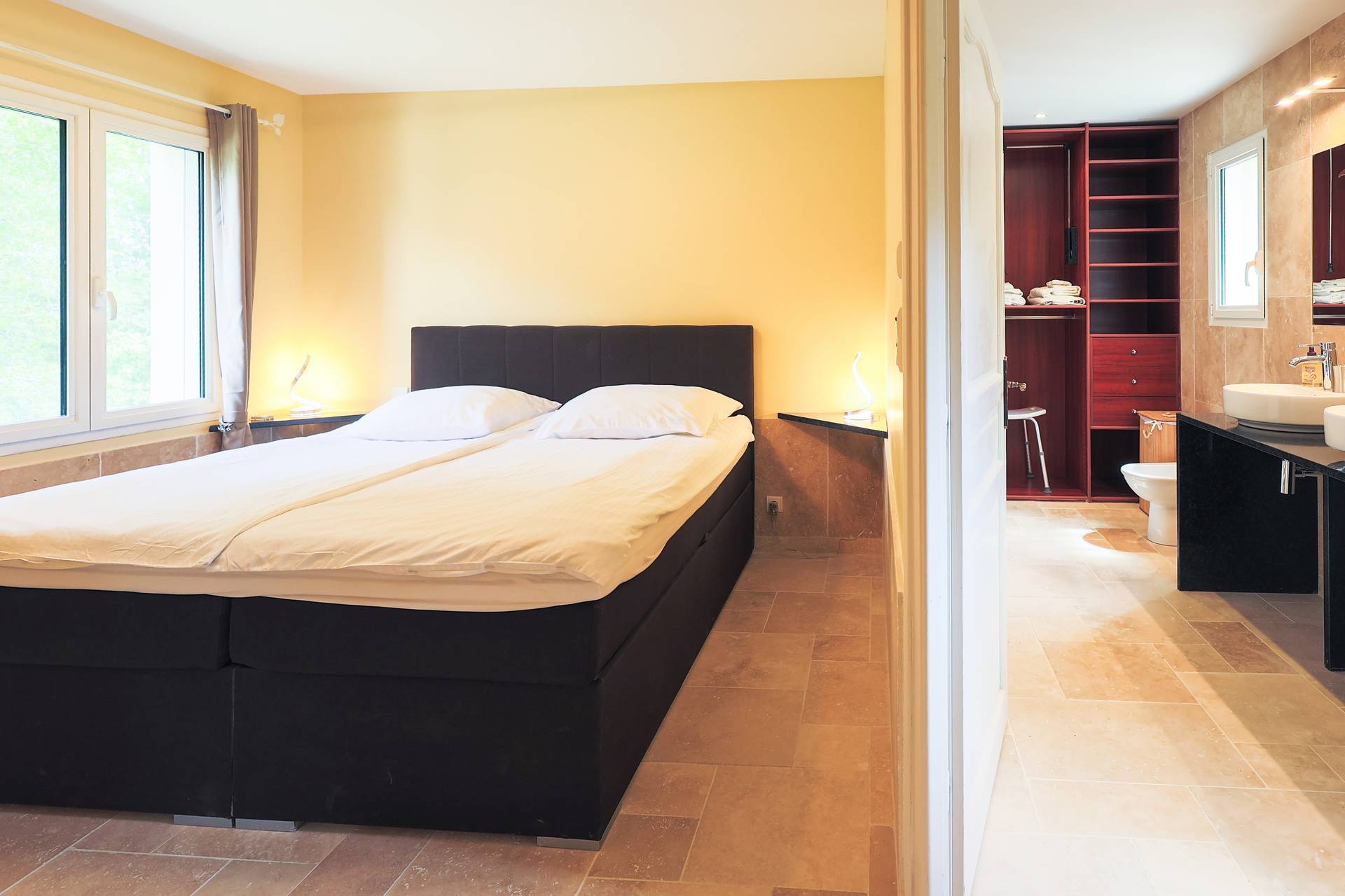 Chambre 1, la chambre principale est située au premier étage et est équipée d'un lit double avec sommier à ressorts et dispose d'une salle de bain attenante avec douche, bidet, double lavabo et un grand dressing. Cette chambre est équipée de la climatisation.