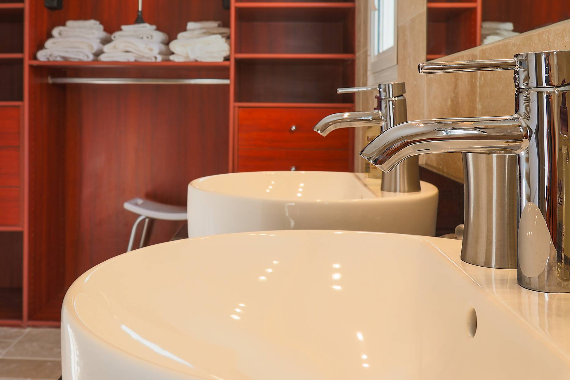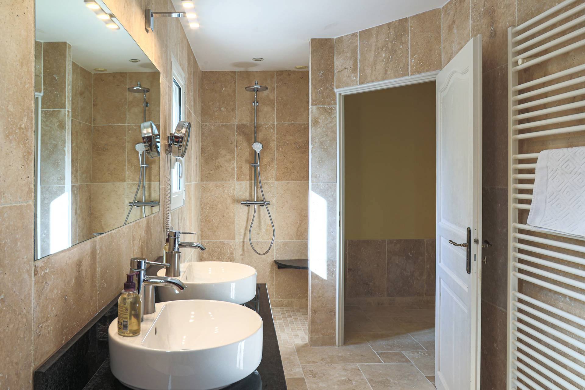 Les chambres 2, 3 et 4 sont situées au rez-de-chaussée et partagent la 2e salle de bain avec baignoire, douche et lavabo double.