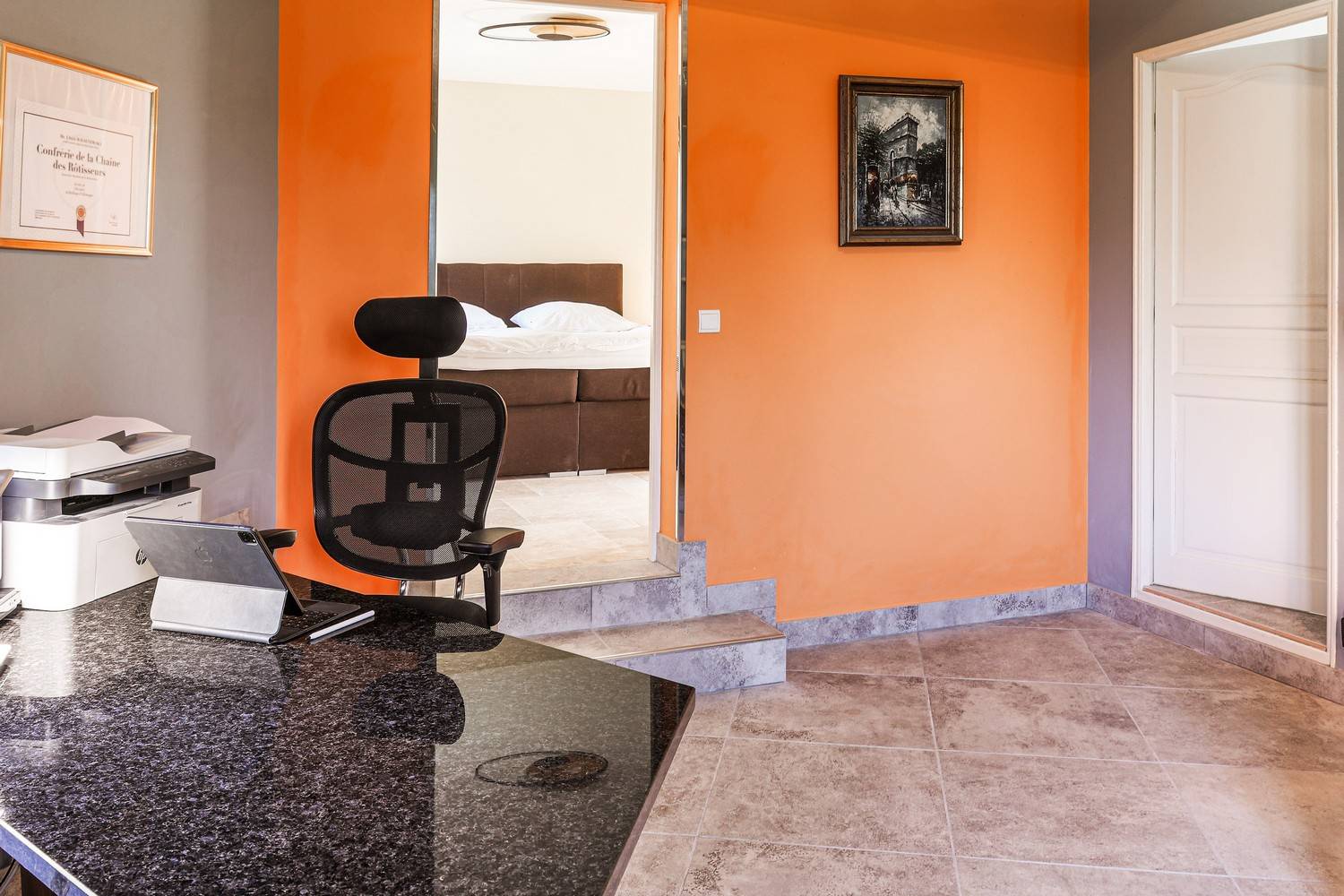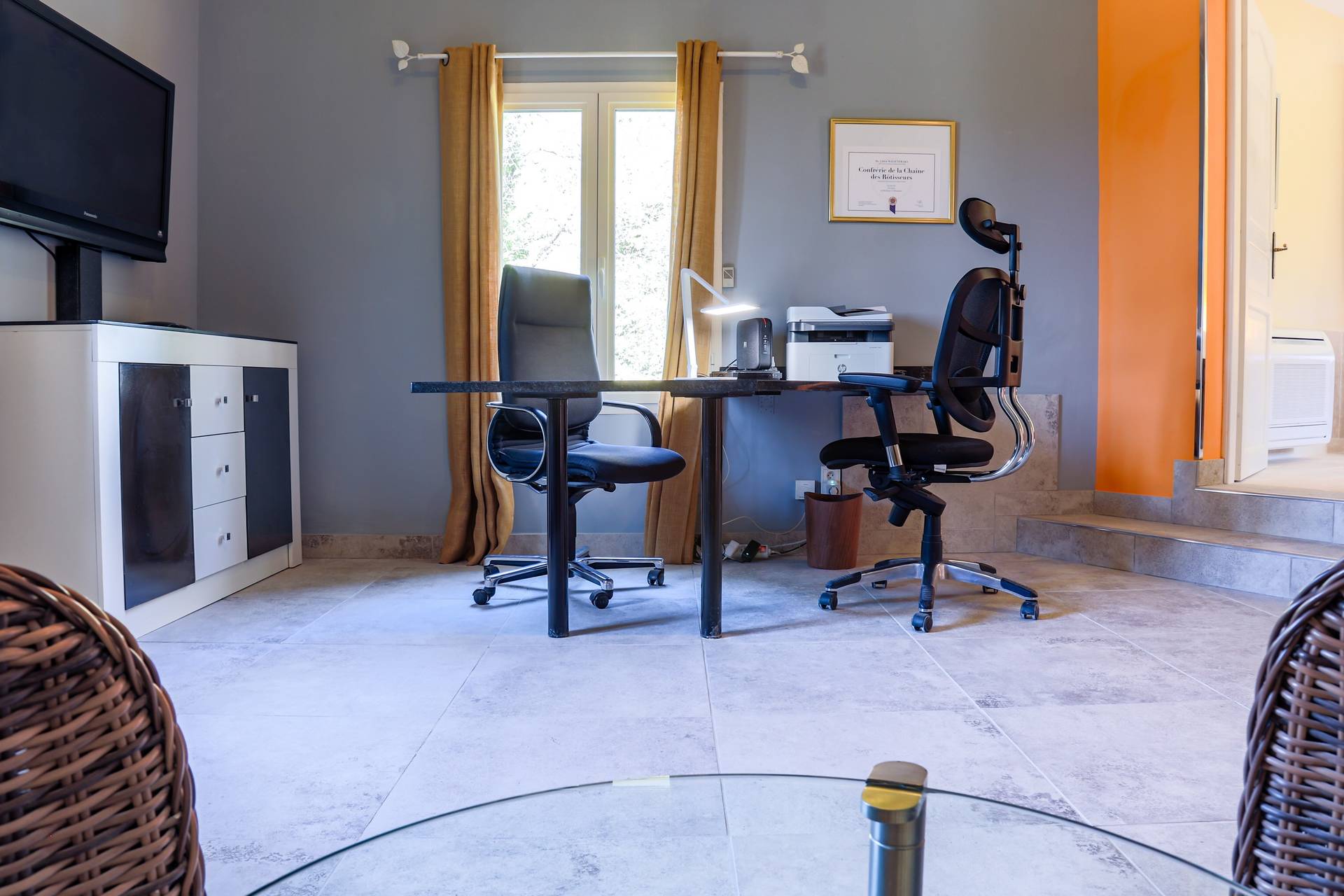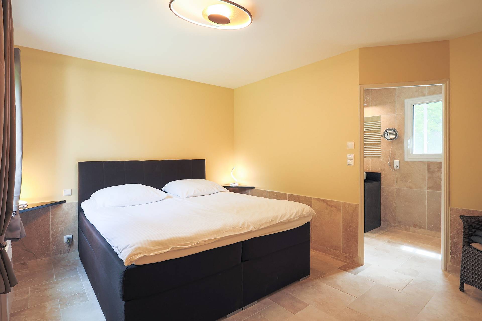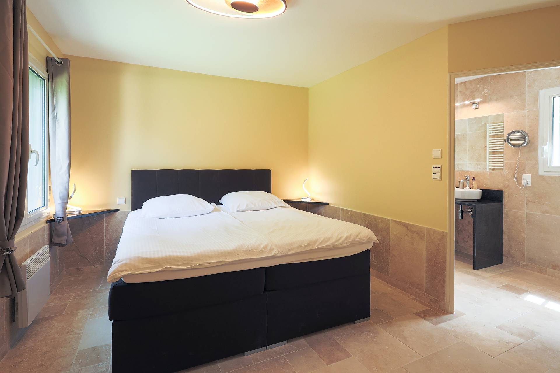 La chambre 3 est la chambre beige et dispose également d'un lit queen-size 160x200 et d'un bureau en granit, d'une télévision et d'une armoire intégrée
