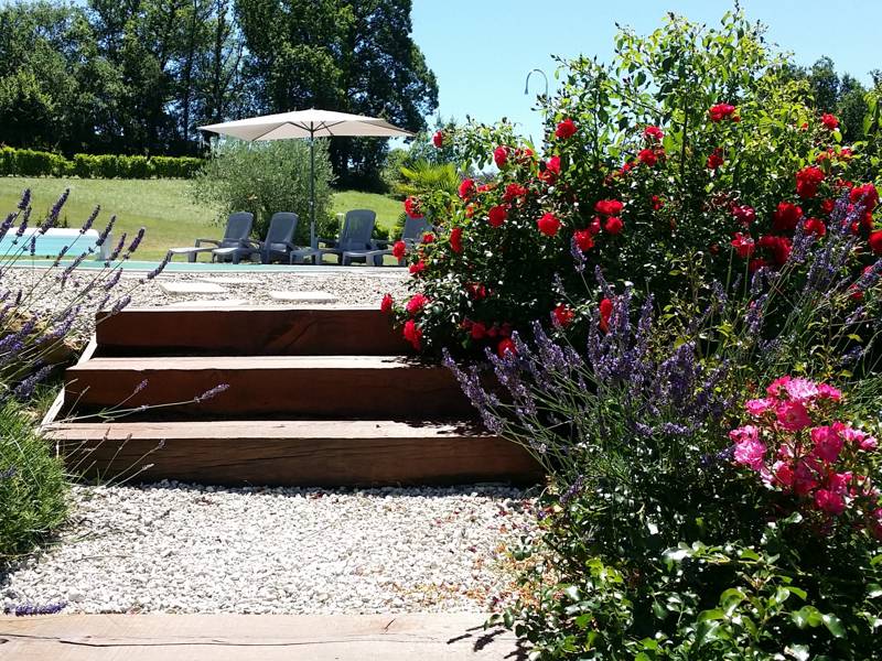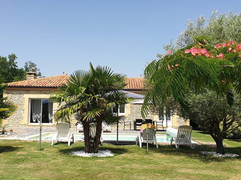 Grand jardin où les enfants peuvent jouer. La piscine chauffée (avec marches) est située directement en face de la maison et est accessible depuis le salon. Il y a un grand parking pour plusieurs voitures. Salon de jardin - transats - parasols - très grand barbecue en pierre.