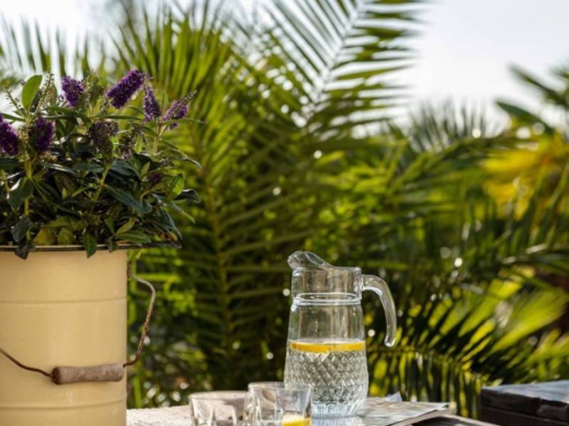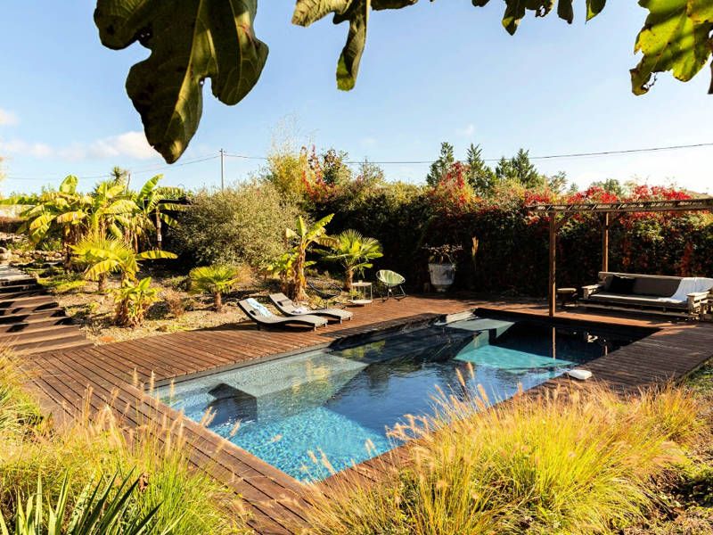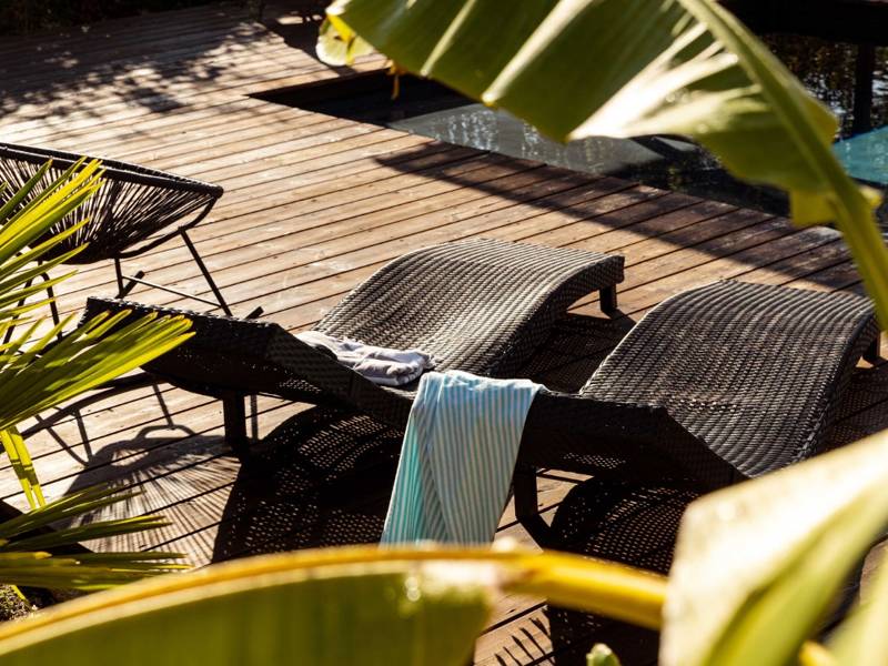 La Villa Saint Martin dispose d'un joli jardin avec plusieurs terrasses, certaines sont couvertes, les autres terrasses sont exposées au soleil. Le jardin est agrémenté de plantes tropicales, mais il y a aussi des prairies où les enfants peuvent jouer. Il y a un certain nombre de balançoires et une tente pour jouer et à proximité se trouve une aire de jeux avec table de ping-pong, terrain de football et court de tennis du village. La Villa Saint Martin dispose d'une belle piscine privée de 4x8m, de 1,5 m de profondeur, d'eau salée, avec un espace de jeu/lecture en eau peu profonde. La piscine est sécurisée par une alarme d'eau - la terrasse en bois attenante à la maison (avec salons extérieurs et table à manger) offre de larges vues panoramiques. De plus, un barbecue est disponible.