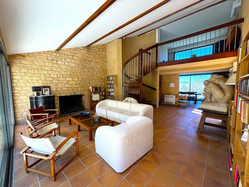 Au niveau terrasse vous trouverez un beau séjour de 70 m², véritable coeur de la maison, avec plus de 6 mètres de hauteur sous plafond, dont les énormes portes-fenêtres. On y trouve une cuisine semi-ouverte entièrement équipée avec un coin repas pour les repas en intérieur. Le spacieux salon où le canapé; fauteuils et table basse sont élégamment disposés autour de la grande cheminée, à disposition pour les soirées plus fraîches.