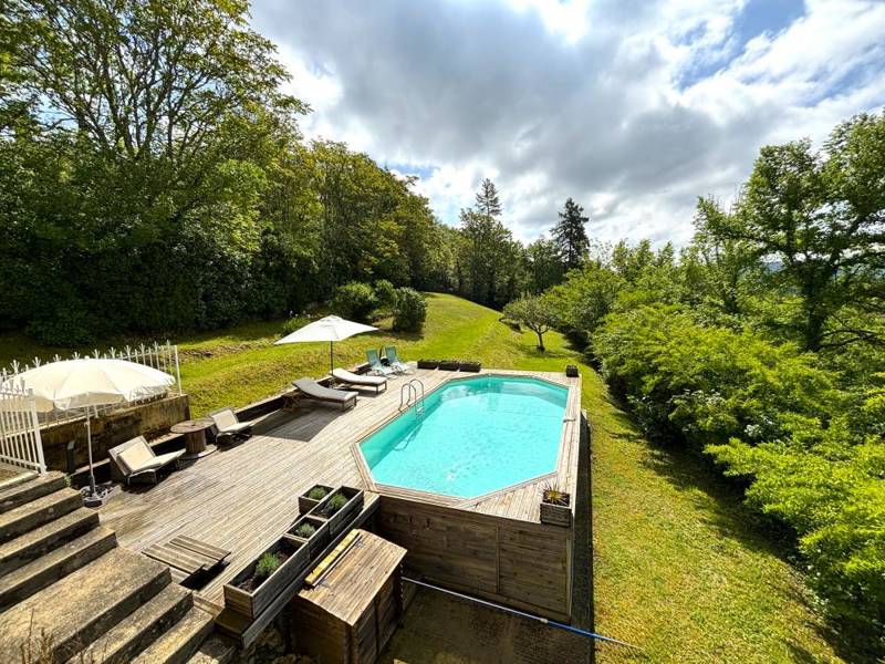 Bien que la maison convienne à tous vos besoins, c'est probablement à l'extérieur que vous passerez la plupart de votre temps à déjeuner sur la grande terrasse, à admirer le coucher de soleil sur la rivière depuis le deuxième pont ou à vous prélasser autour de la charmante piscine privée. Le grand jardin de 1000 m² offre plusieurs pelouses et terrasses. La première grande terrasse, près du salon et de la cuisine, est équipée d'une grande table à manger et de 8 chaises, afin que vous puissiez déjeuner à l'extérieur. Un auvent vous protège de la chaleur estivale. La deuxième terrasse en bois a une vue sur la piscine et a été spécialement décorée pour vous permettre de profiter de la belle vue sur la rivière et la vallée. La piscine privée mesure 8,60 x 4,70 m et 150cm de profondeur. Il y a une place de parking pour 3 voitures à proximité immédiate de la maison. Possibilité d'accéder à la maison par un petit chemin plat, idéal pour les balades à vélo.