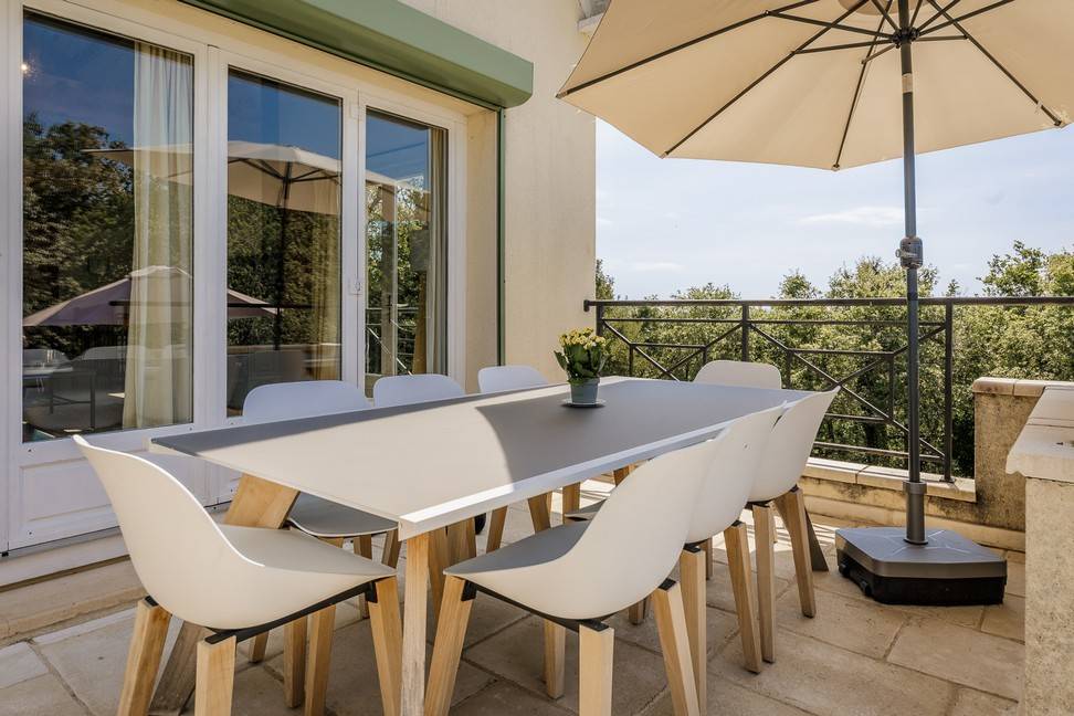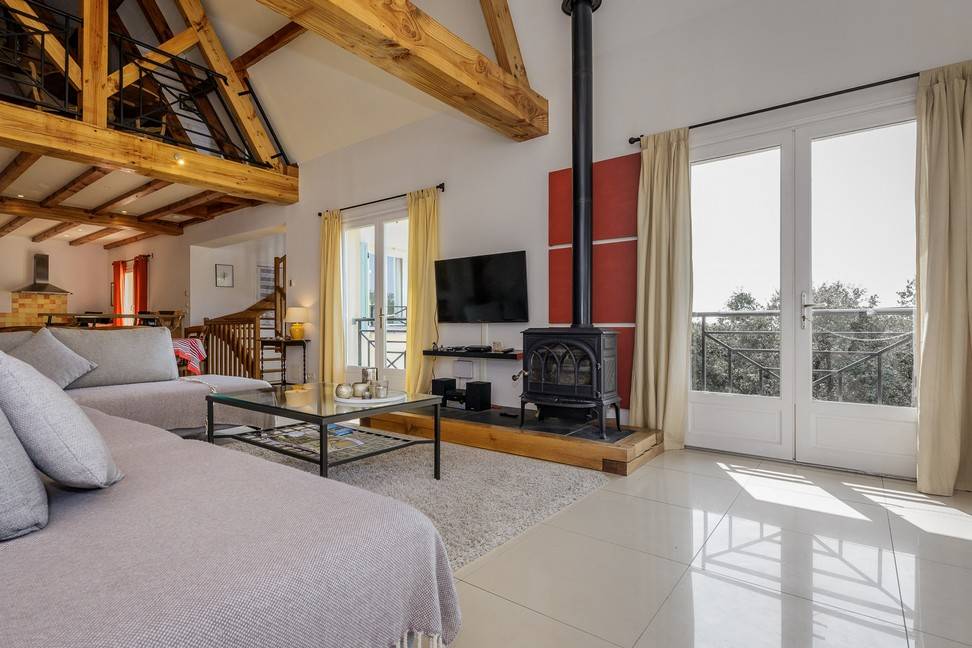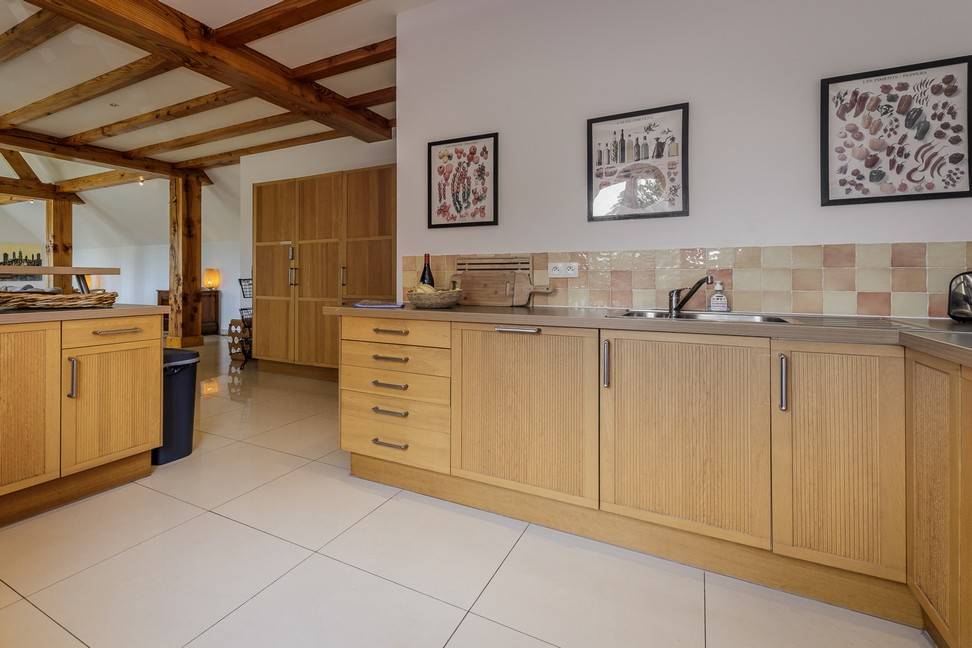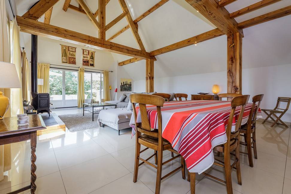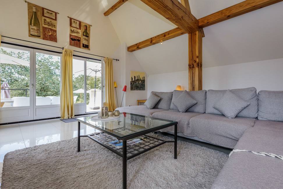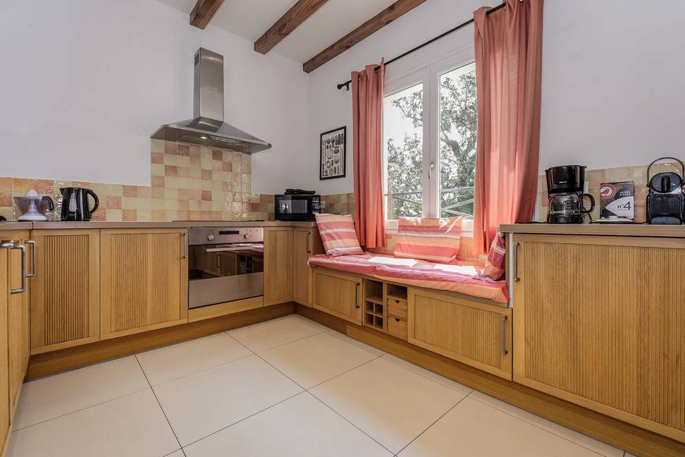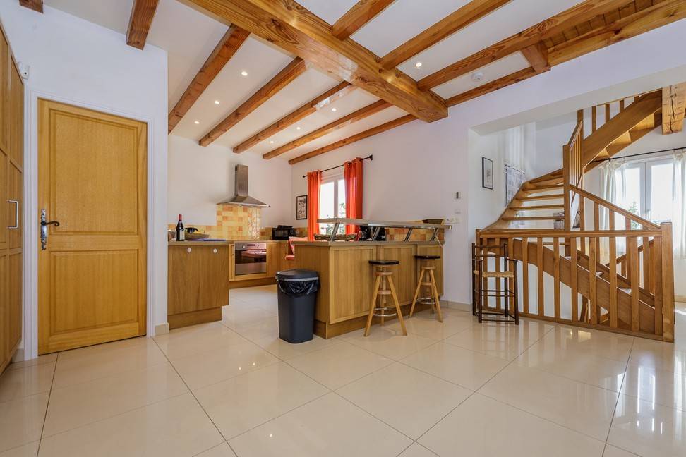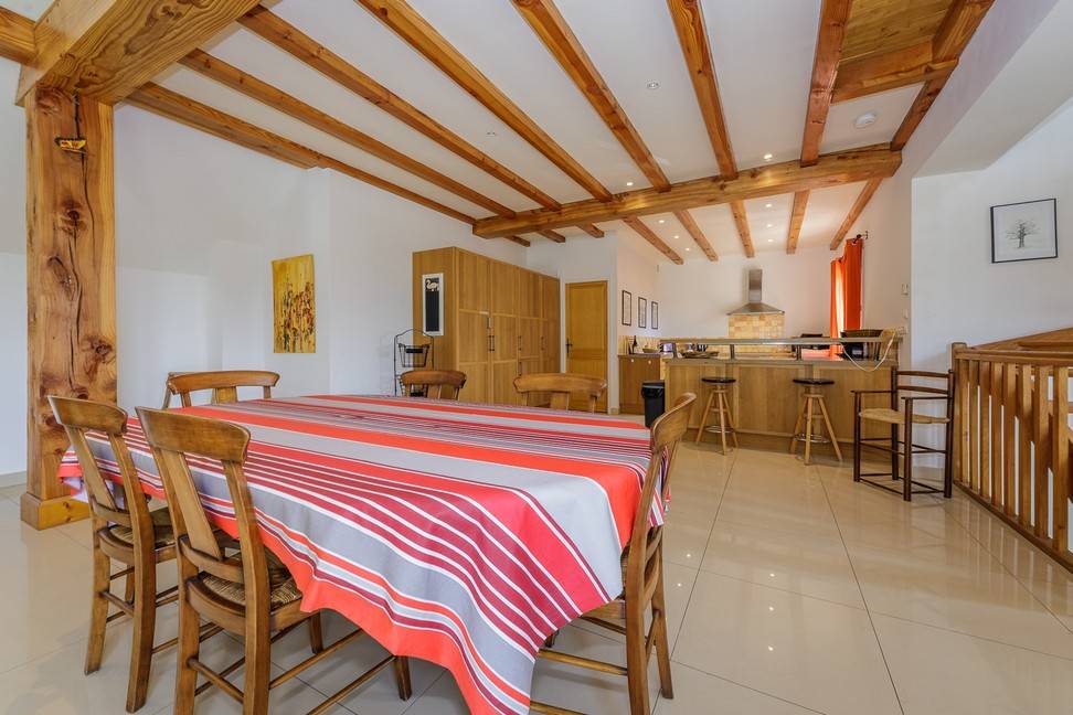 La cuisine spacieuse est bien équipée (four, micro-ondes, lave-vaisselle) et les portes coulissantes mènent au salon confortable (TV, DVD, CD, poêle à bois) et à la terrasse extérieure. Via 5 petites marches, vous atteignez la piscine adjacente et la terrasse inférieure. La terrasse et la piscine sont toutes deux positionnées de manière à ce que vous puissiez profiter pleinement du soleil en journée et du soleil du soir.