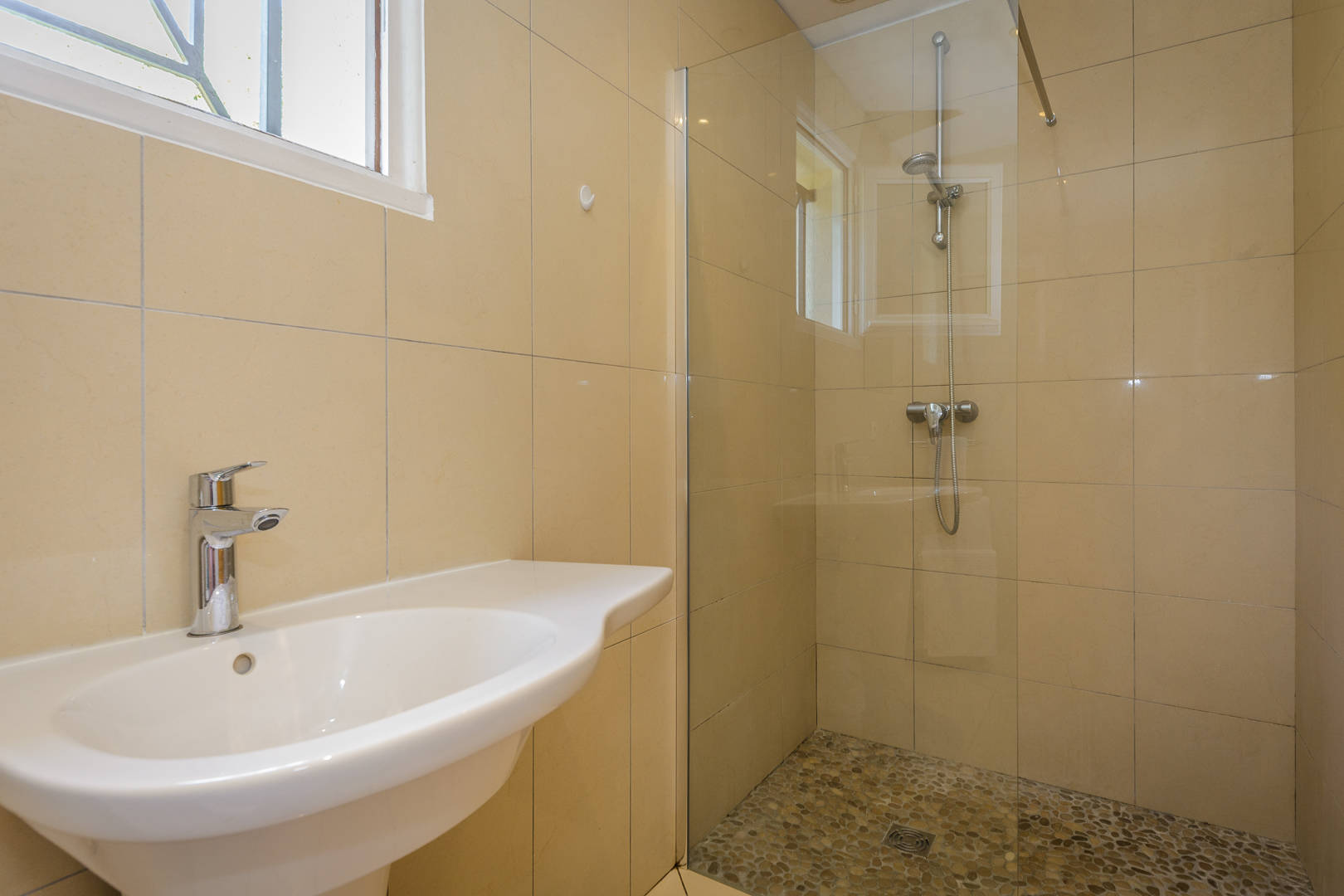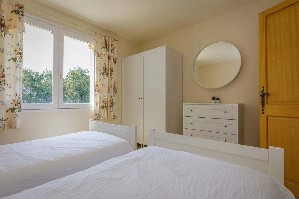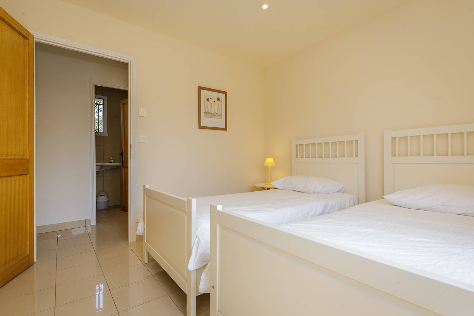 La chambre 3 a 2 lits simples 90 x 200 avec une salle d'eau privative et des portes-fenêtres donnant sur le jardin. Buanderie (lave-linge).