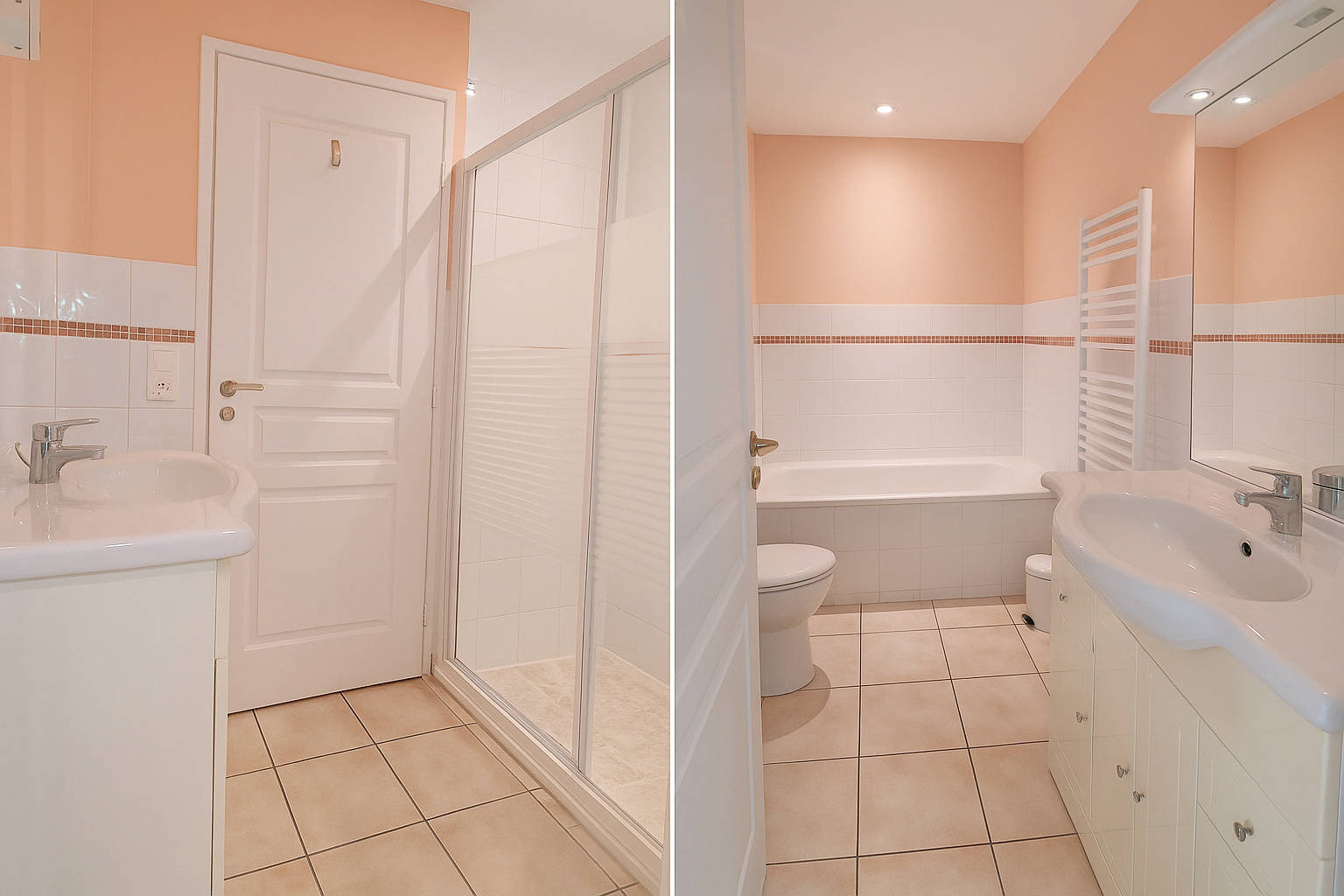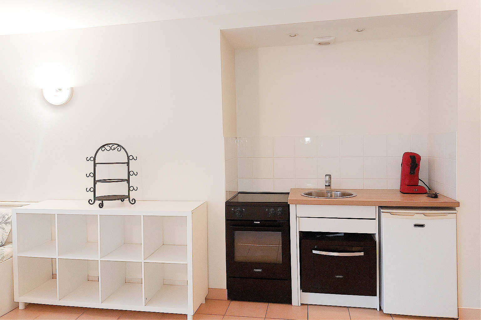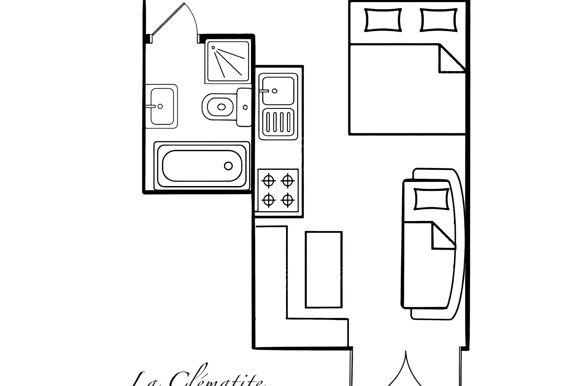 De slaap- en leefruimte zijn gecombineerd en ingericht met een queensize bed (160x200), een slaapbank en een eethoek met tafel en bankje. De tv biedt Franse zenders. De badkamer beschikt over een inloopdouche, ligbad, toilet en wastafel.
