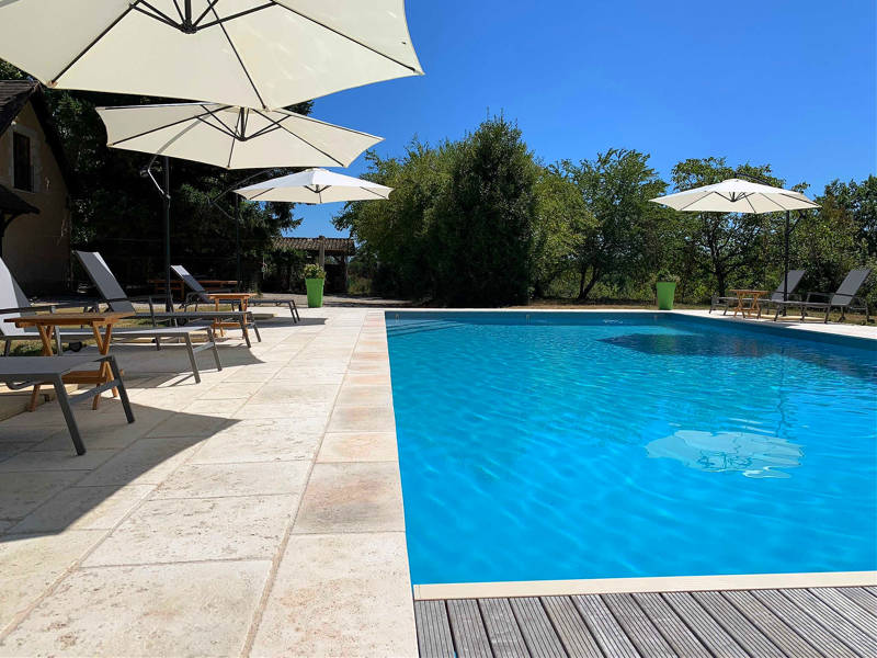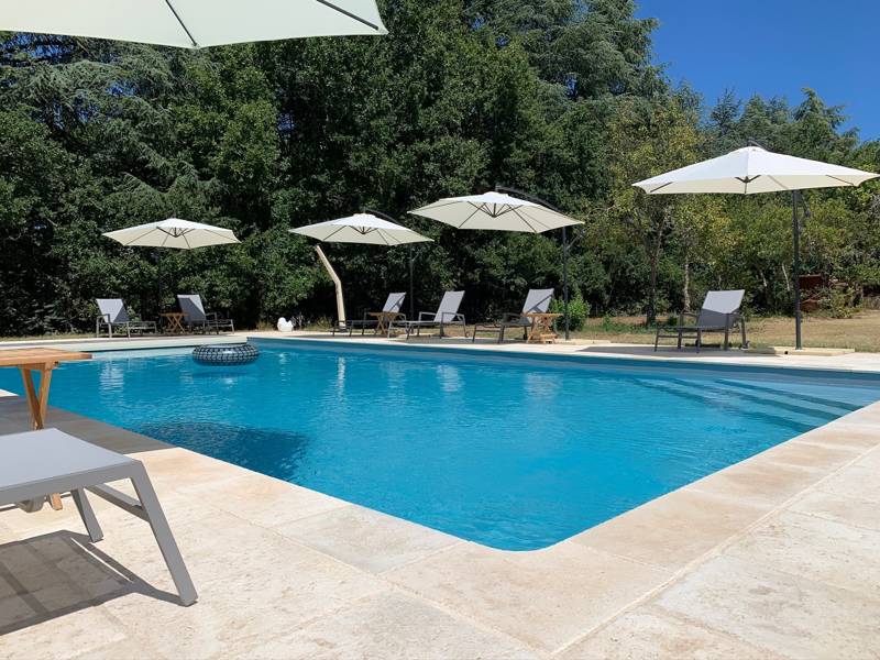 Het huis is omgeven door prachtige tuinen, die 5.000 m² beslaan. De tuinen bestaan uit gazons, bos en bloemen. De oprit voor Domaine Le Relais wordt geflankeerd door platanen. Voor Domaine Le Relais vindt u een overdekte eethoek met steenoven. Achter het huis is een groot terras met eettafel en stoelen, dat toegankelijk is via de keuken en het eetgedeelte. Hier vindt u ook het zwembad (14 m lang en 6 m breed) omgeven door een terras met ligstoelen. Voor en naast de woning is voldoende parkeergelegenheid. Het zwembad is ideaal om baantjes te trekken of voor de kinderen om in te spelen. Voor onze kleine gasten is er een kinderspeelhuis met glijbaan en schommel, zandbak en wipwap.